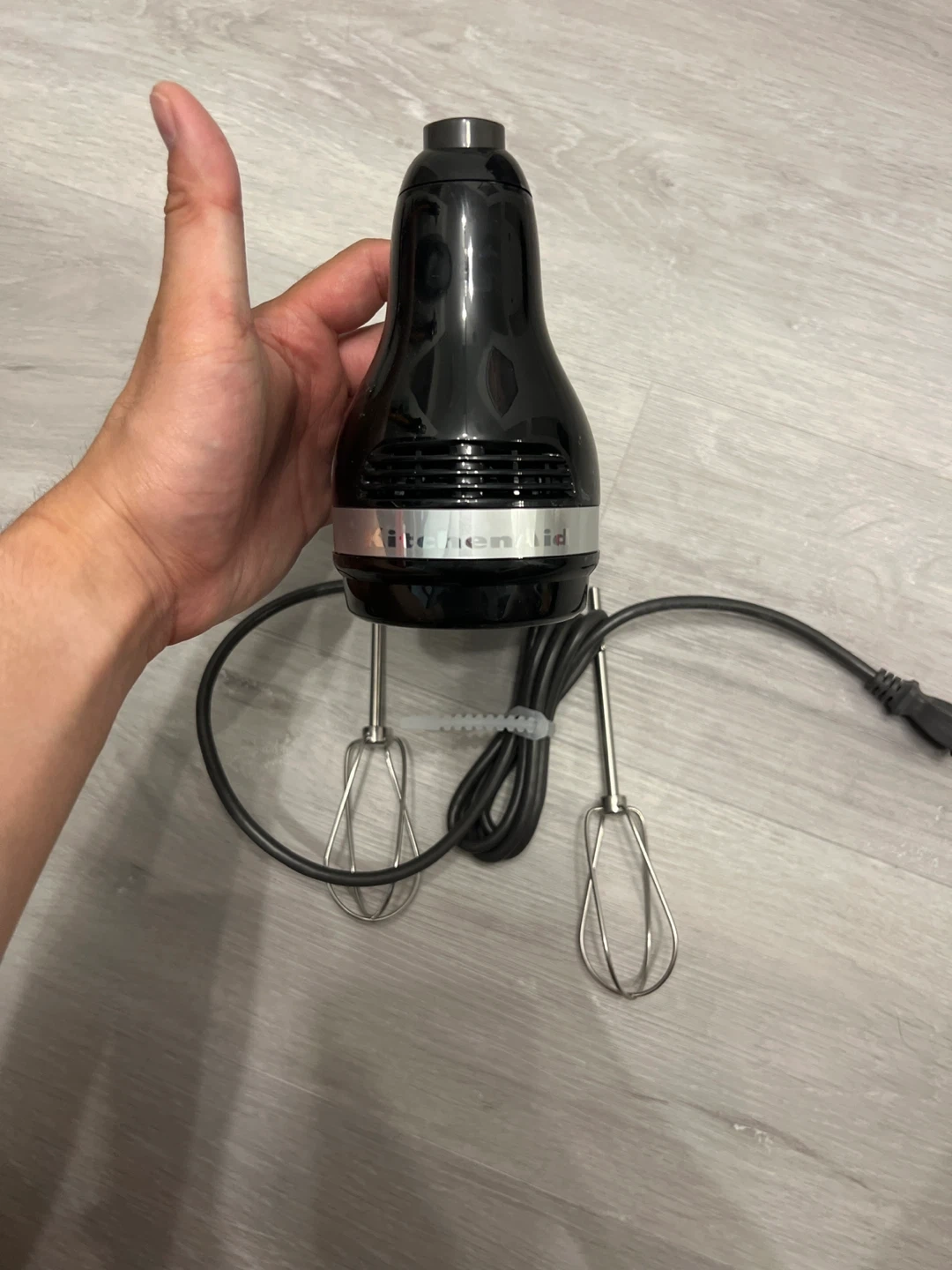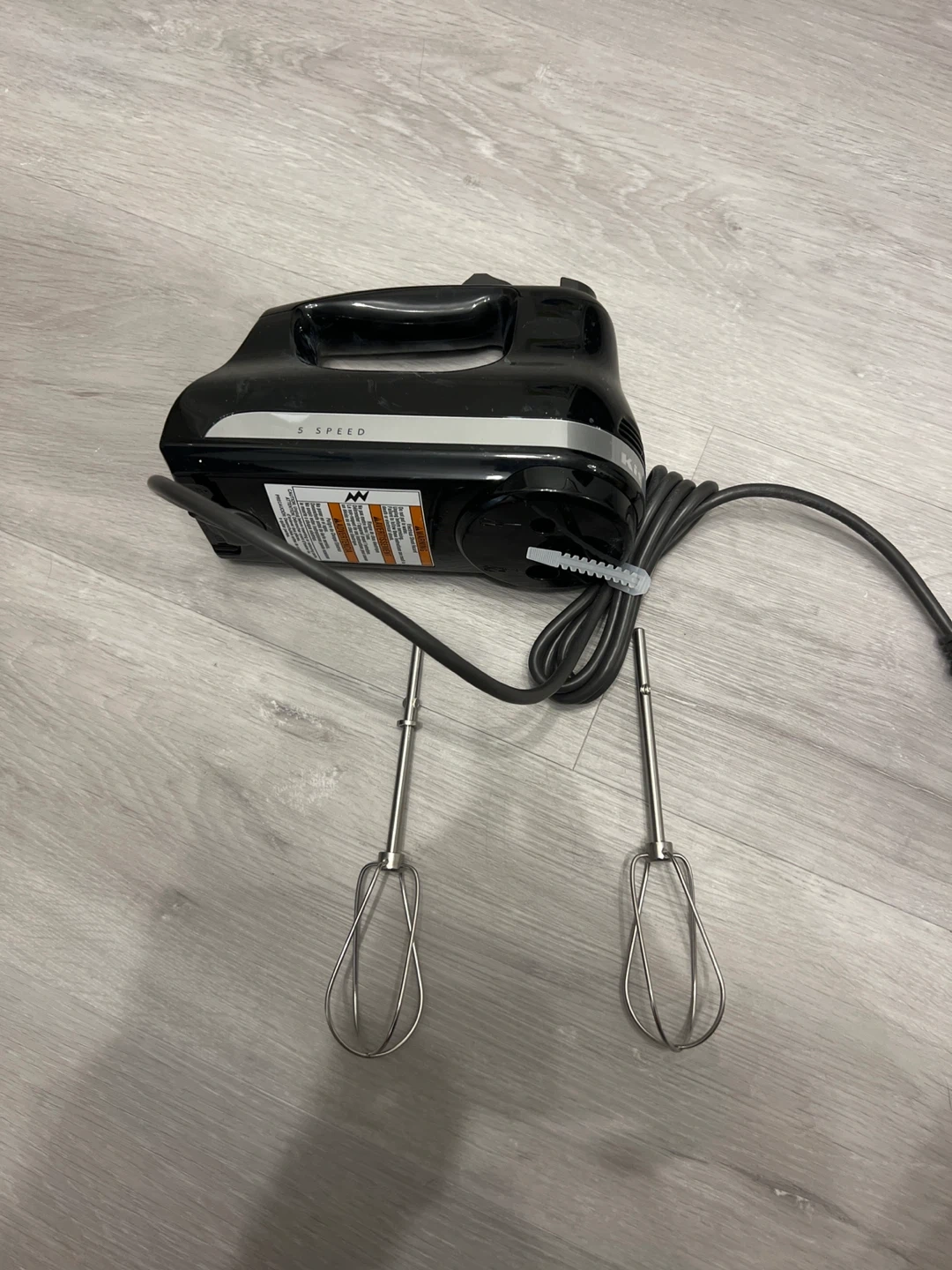 Selling a KitchenAid 5-speed hand mixer in black. It's in great shape and ready to help with all your baking needs! It comes with the beaters, as shown in the photos.