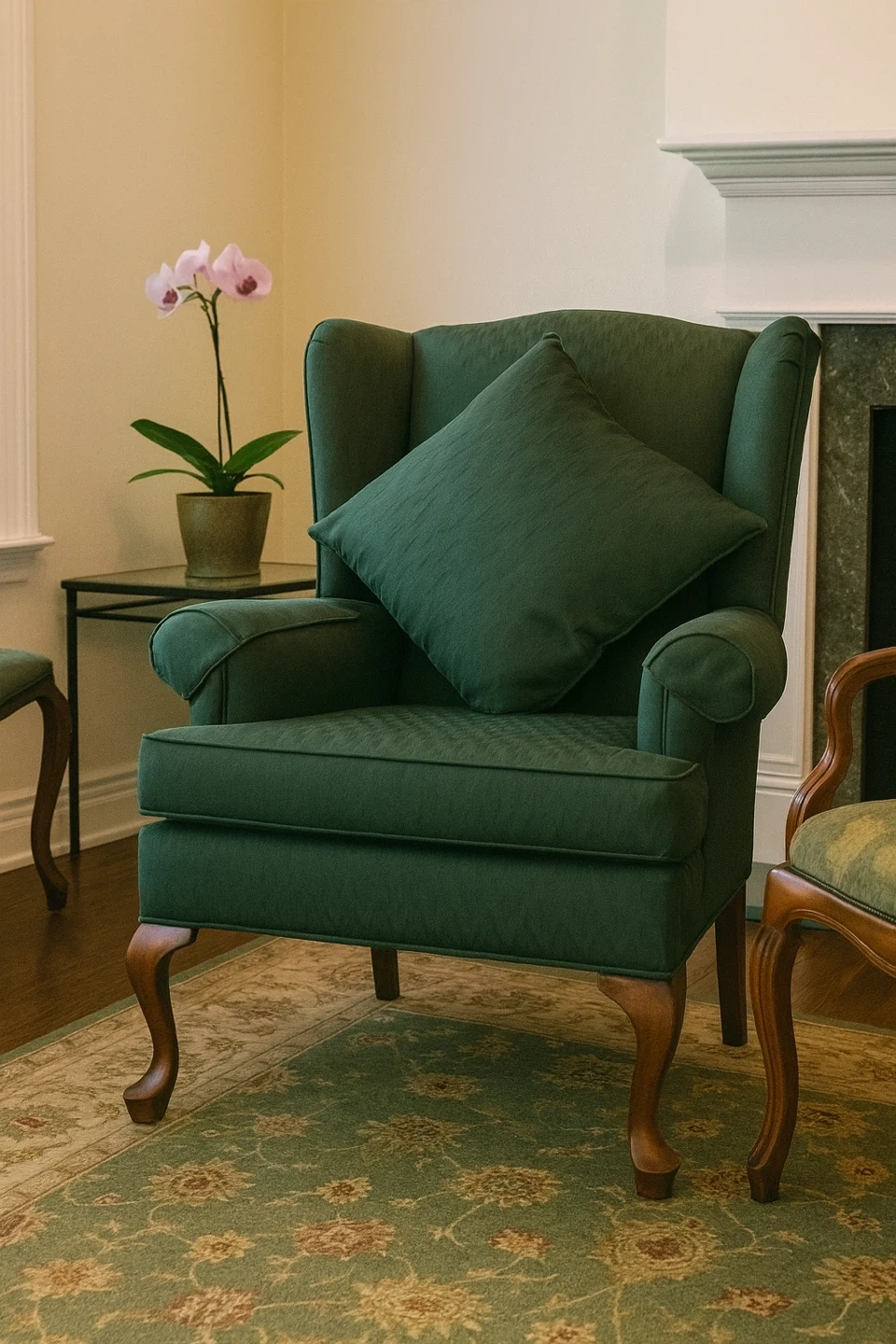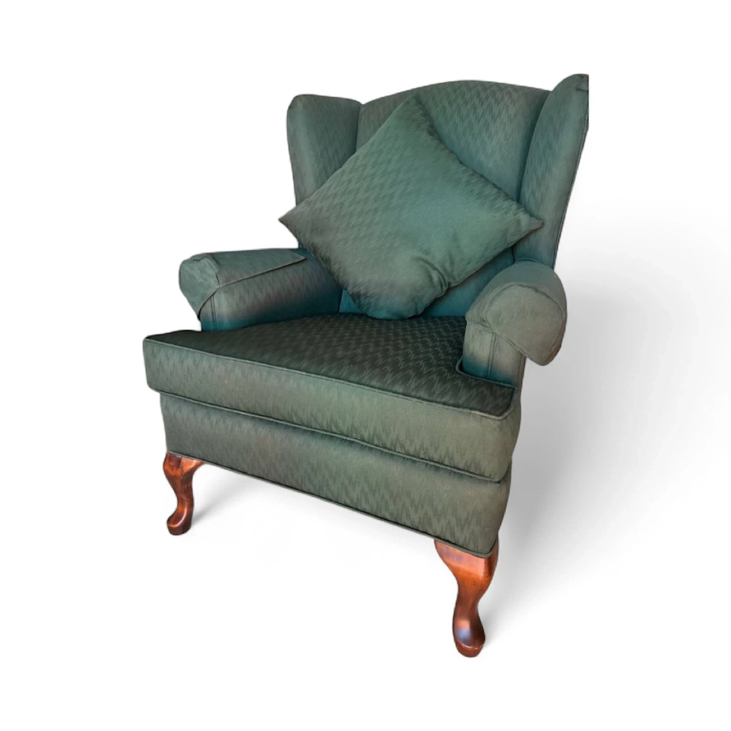 Comfortable green wingback armchair with a matching cushion! It's in great condition and ready to add a touch of classic style to your living room or reading nook. The chair features a sturdy frame and a cozy, supportive design.