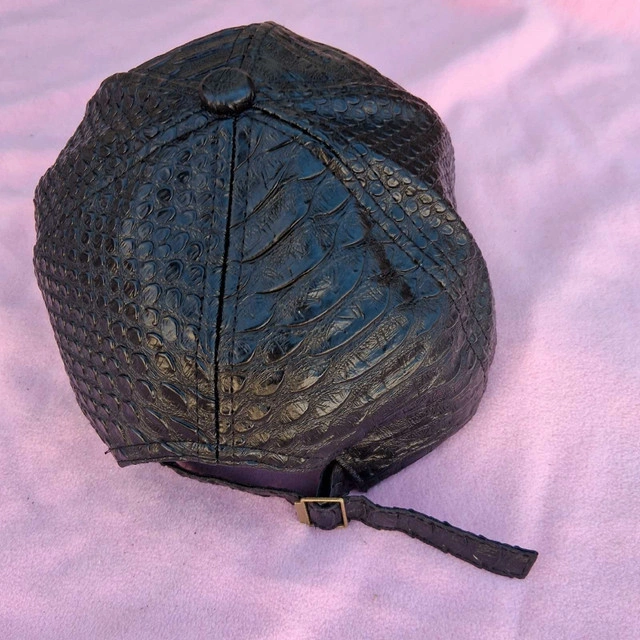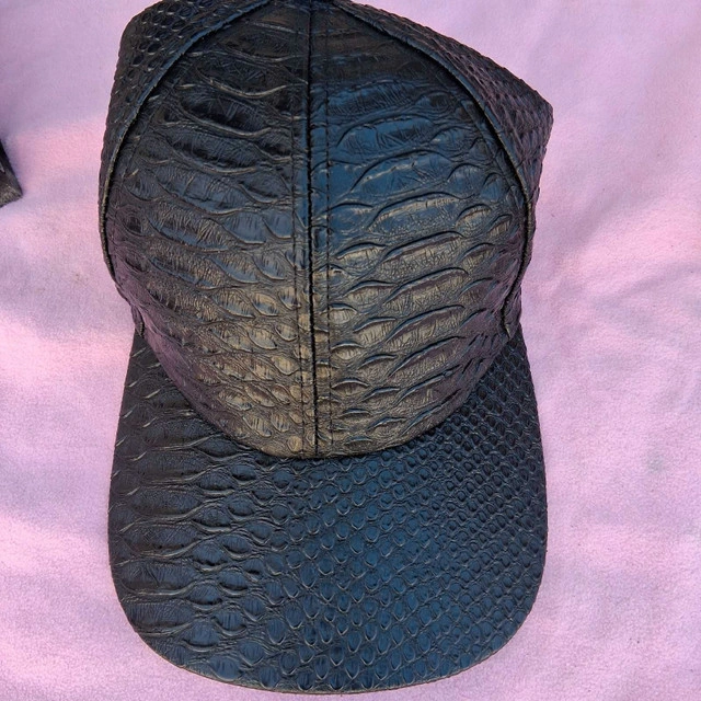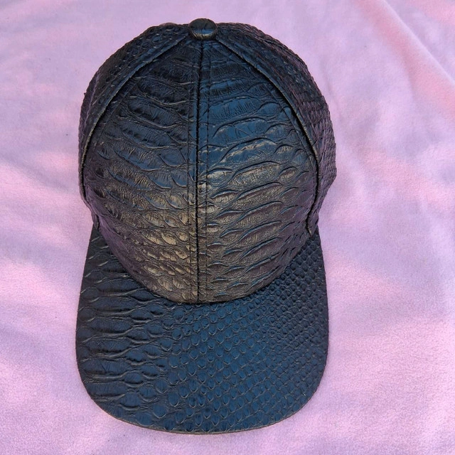 This brand new leather black hat features a unique snakeskin texture and an adjustable strap. It's a stylish accessory to add to your wardrobe! * Material: Leather * Colour: Black * Size: Adjustable Looking to add a little bit of edge to your style? This hat is perfect! And just a heads up, if you are seeing this ad, the hat is still up for grabs!