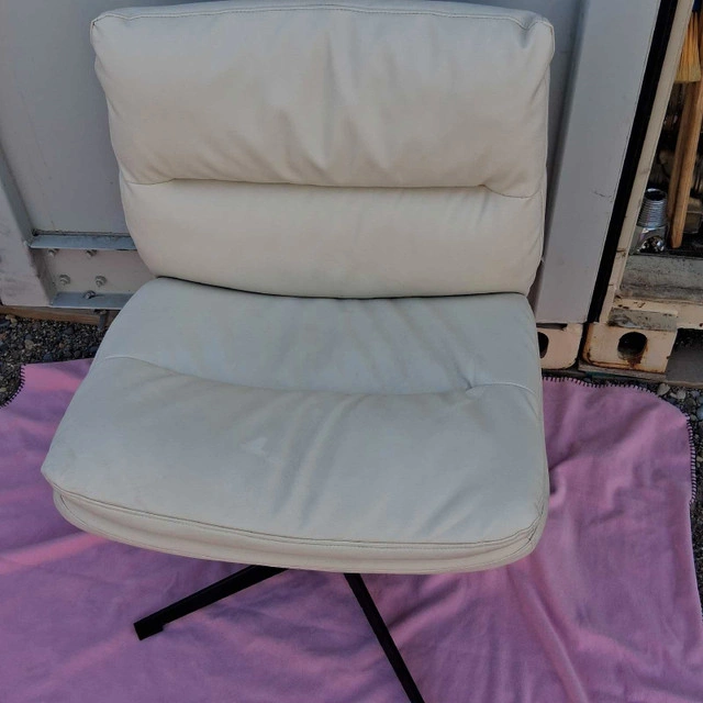 This is a stylish white leather office/desk chair, perfect for any home or professional workspace. It is in good condition and provides excellent comfort and support for long hours of use. Here are some details: * Colour: White * Material: Leather * Style: Modern * Adjustable height * Swivel base Also, just so you know, if this ad is still up, then yes, it's still available!