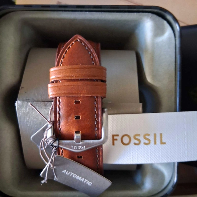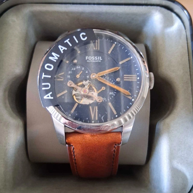 I'm selling a stylish Fossil automatic watch that features a striking design with a visible movement and a classic leather strap. The watch is in good condition, with only minor signs of wear. It comes with its original box and documentation. Here are some details: * Brand: Fossil * Movement: Automatic * Strap Material: Leather Looking to find a new home for this timepiece!