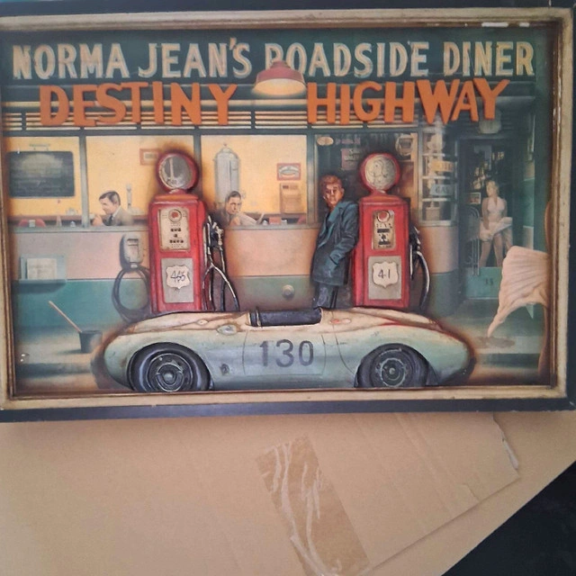 Add a touch of vintage Americana to your space with this unique Destiny Highway Norma Jean's Roadside Diner 3D art piece. The artwork features a classic roadside diner scene with a vintage car and gas pumps, creating a nostalgic and eye-catching display. This is a used item, but it is in good condition, ready to be displayed in your home, office, or garage. It's a conversation starter and a great piece for collectors of vintage memorabilia. If the ad is up, it's still available!