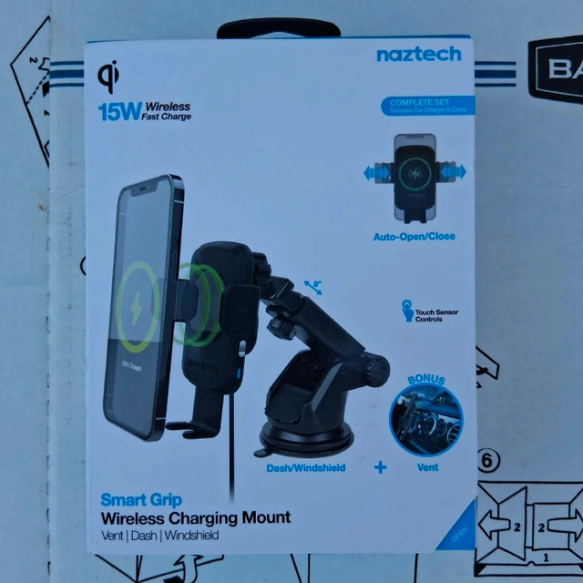Selling a new Naztech 15W wireless fast charging mount. It's a complete set including car charger and cable, featuring auto-open/close and touch sensor controls, compatible with dash/windshield and vent installation. Key features include: * 15W Wireless Fast Charge * Auto-Open/Close * Touch Sensor Controls * Dash/Windshield + If the ad's still up, the item's still up for grabs!