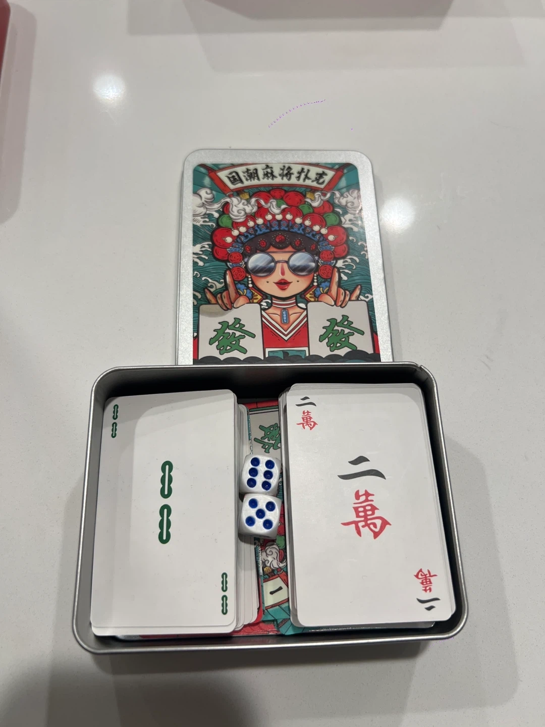 Selling a mahjong card game set, complete with dice! It comes in a cute tin case, perfect for travel or storage. Enjoy playing this classic game with friends and family
