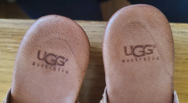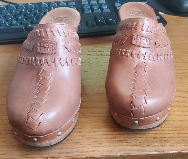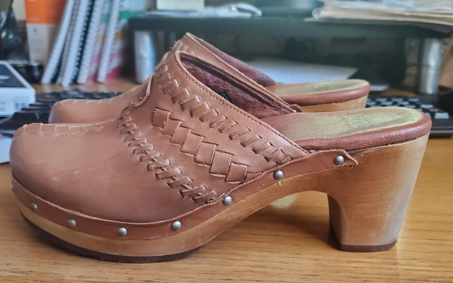Cushioned footbed with genuine shearling at ball of foot. Leather uppers with woven and stud detail. Lined in leather. Great condition with slight wear on the back of the heels.
