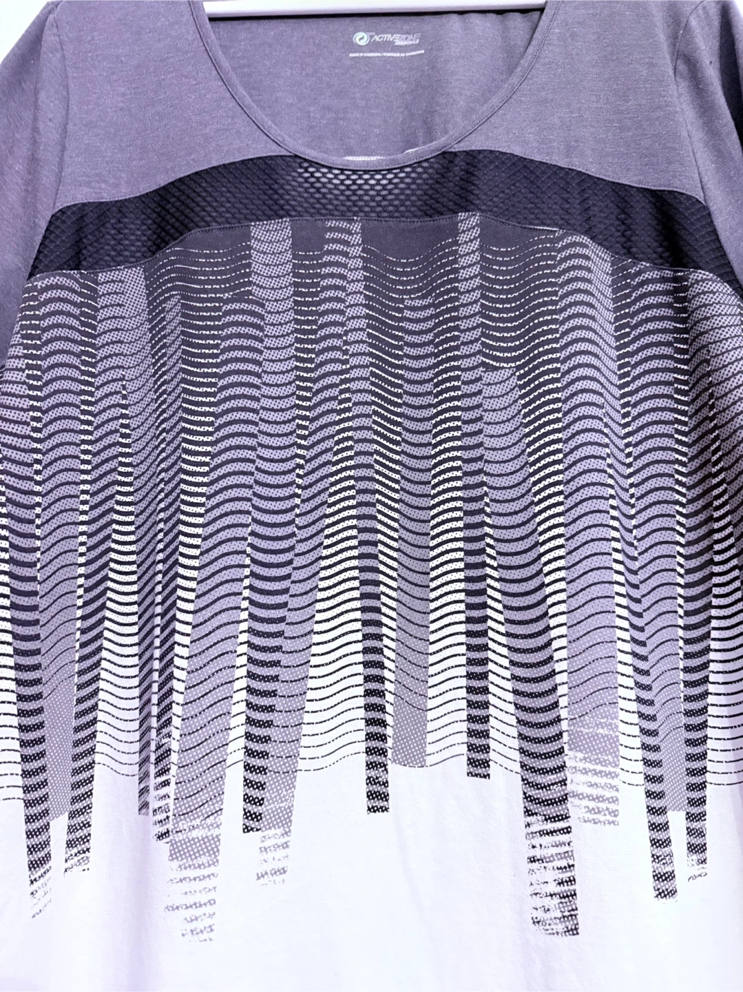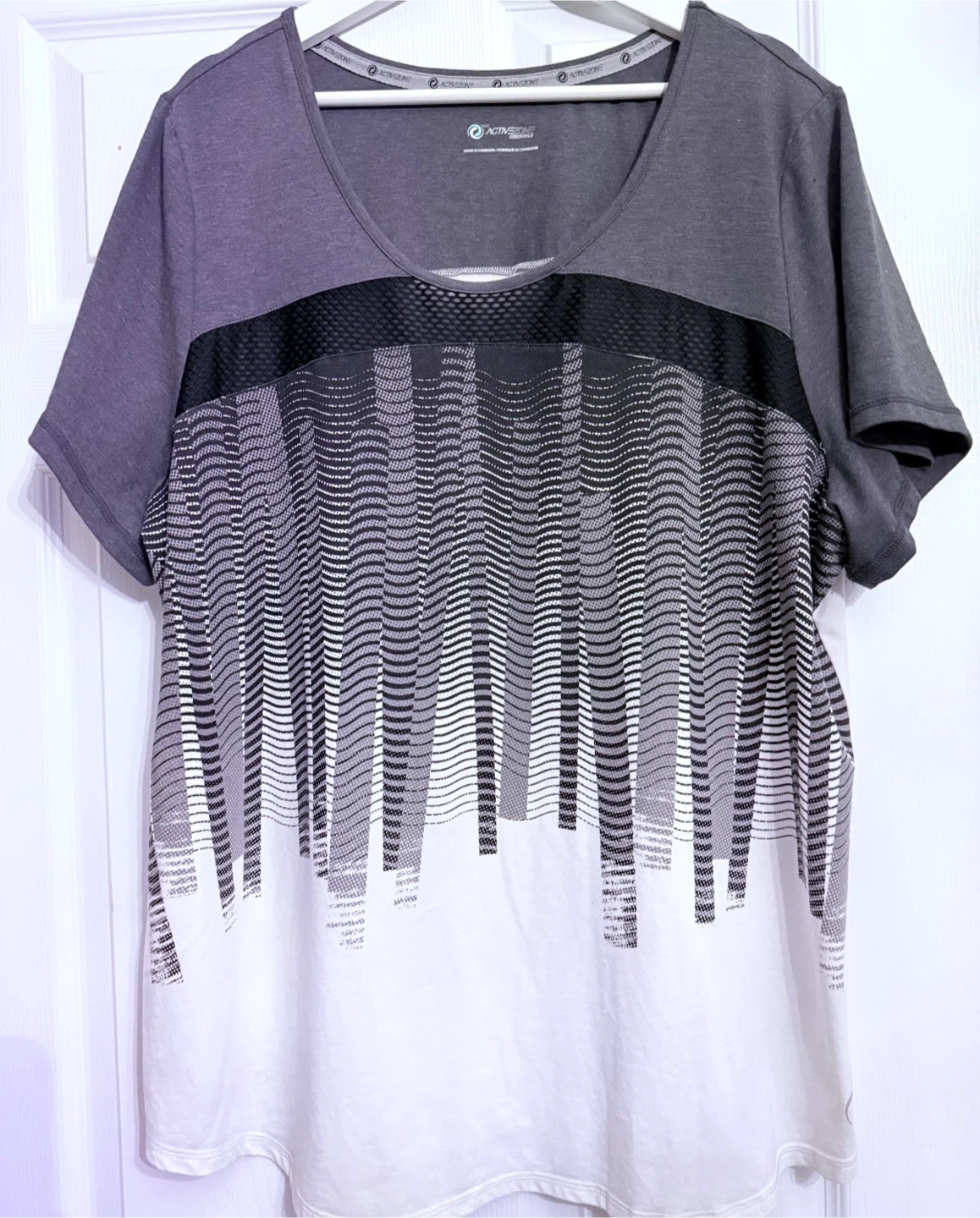 Selling a comfy Active Zone Essentials t-shirt! It's a stylish grey and white colour, perfect for casual wear or workouts. The design features a unique pattern on the front. It's in great condition and ready for a new home Ptp 27” Length 32”