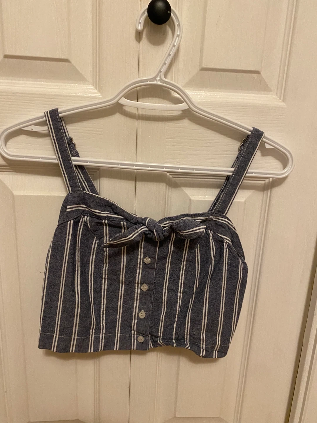 Cute Brandy Melville tank top with a blue and white striped pattern. It features adjustable straps and a tie front detail.