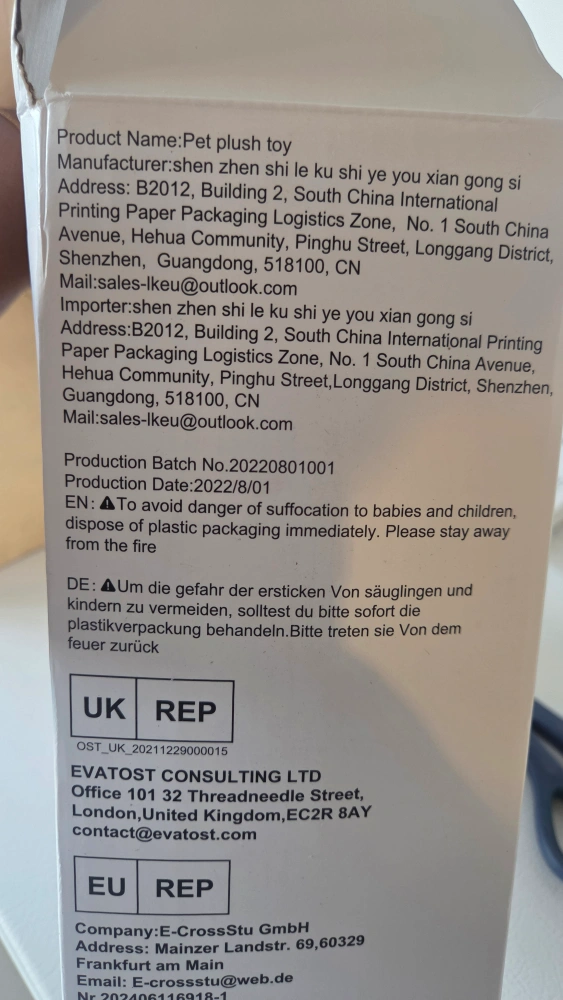 Selling a Weok pet plush toy. The production date is 2022 August 01. Please note the warnings on the packaging regarding danger of suffocation to babies and children and to dispose of plastic packaging immediately