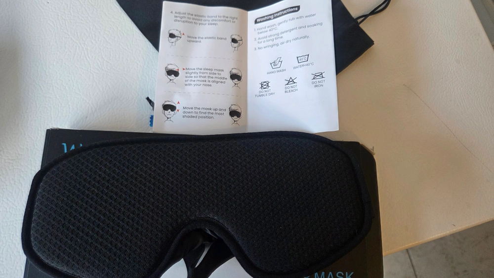 Selling a black sleep mask. It comes with the original box and instructions. The instructions include washing instructions: hand wash gently with water below 40°C, avoid strong detergent and soaking for a long time, and no wringing, air dry naturally