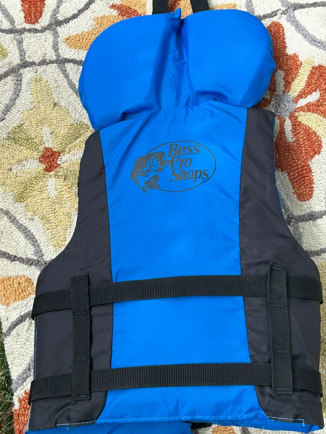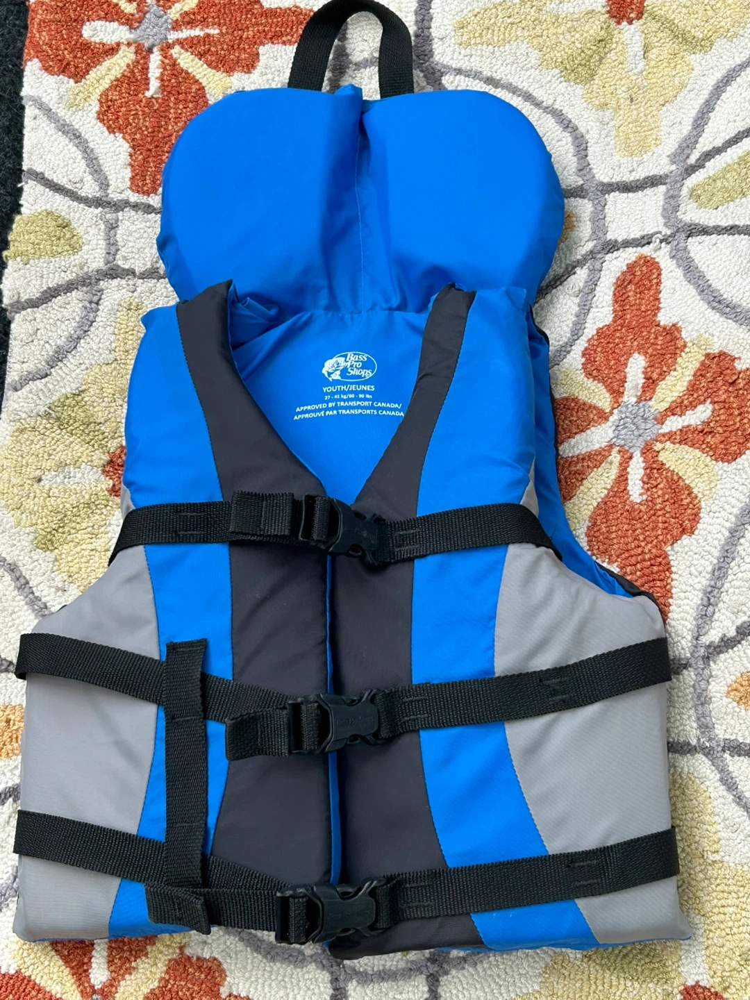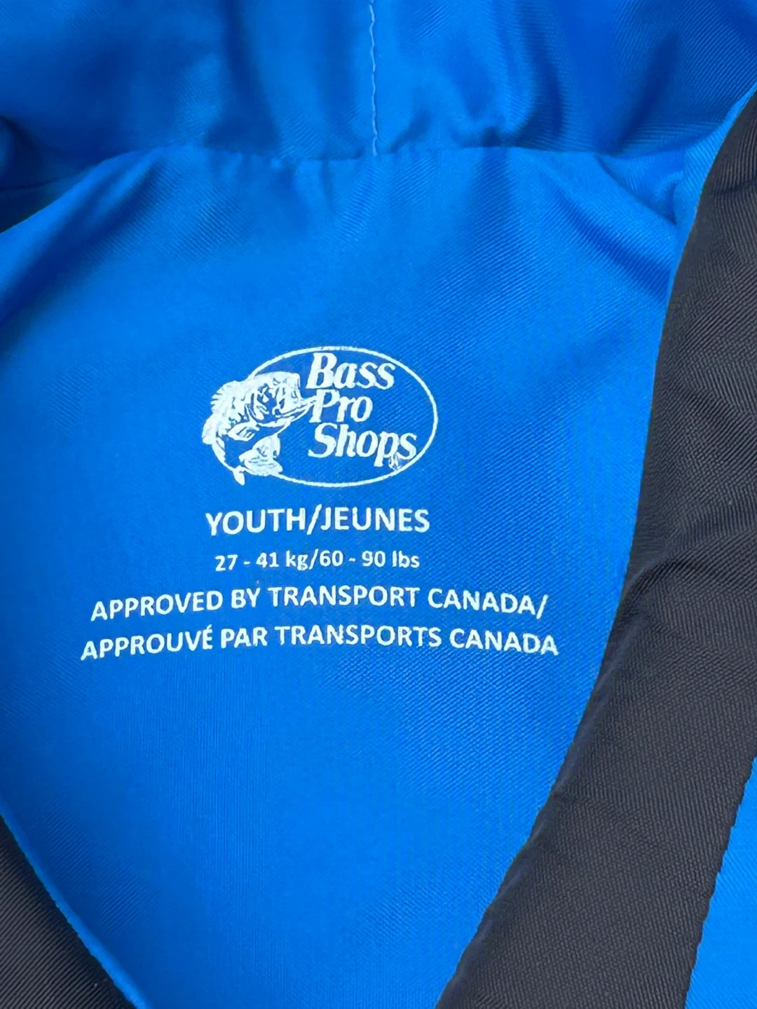 Youth life jacket from Bass Pro Shops, perfect for kids weighing between 60-90 lbs (27-41 kg)! It's in great condition and ready for some fun on the water. This jacket is approved by Transport Canada, so you know it's safe and reliable