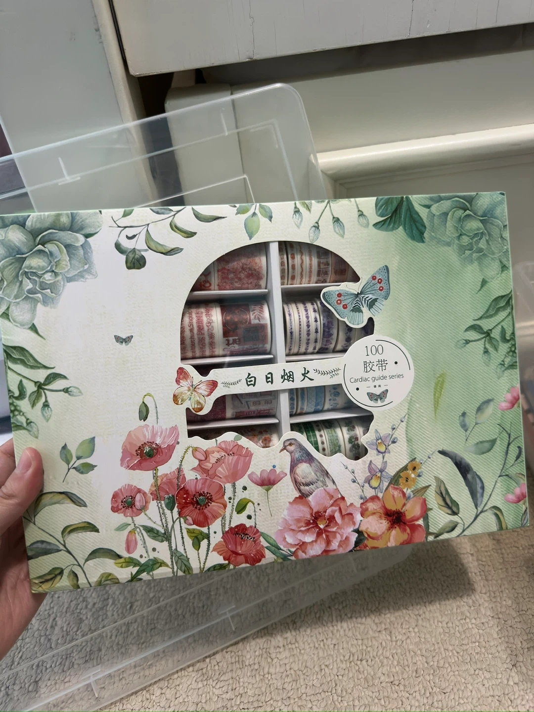 Selling a brand new set of 100 washi tapes from the Cardiac Guide series! These decorative tapes come in a variety of colours and patterns, perfect for scrapbooking, journaling, or adding a touch of flair to your crafts. The tapes are neatly arranged in a box.