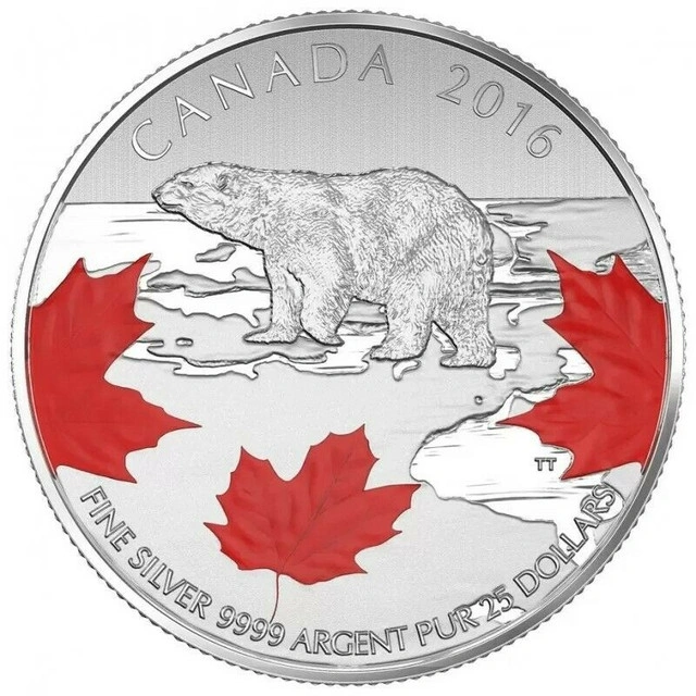 2016 Canadian $25 for $25 True North/Polar Bear Fine Silver Coloured Coin. As the 150th anniversary of Canadian Confederation approaches, the Royal Canadian Mint proudly celebrates the great icons of this diverse land. Canada’s North is one of the nation’s most distinctive regions and a beloved symbol of the stalwart spirit, historic exploration, and striking adaptability that underlies the Canadian story. Commemorate Canada’s Arctic sovereignty, legacy of exploration, stunning northern fauna, and upcoming 150th birthday with this beautiful engraved and coloured coin. Features - Masterfully crafted in fine silver (99.99% pure) - Striking design enhanced with vibrant colour - GST/HST Tax exempt Design The reverse image by Canadian artist Trevor Tennant features a polar bear striding across a stylized contour map of the Canadian Arctic coastline. The image centres on the polar bear, presented in full-body profile and viewed from its left side. The bear is captured in intricate detail in a photo-realistic style. Beneath its feet is a contour map of the Arctic coastline—a vast landmass composed of numerous islands and inlets, leading to a wide-open horizon. Three sugar maple leaves in bright Canadian red punctuate the bottom half of the image. The reverse is engraved with the words “CANADA” and “FINE SILVER 9999 ARGENT PUR”, the date “2016”, and the face value of “25 DOLLARS”. The obverse features the effigy of Her Majesty Queen Elizabeth II by Susanna Blunt. Packaging 2016 Canadian $25 for $25 True North/Polar Bear Fine Silver Coloured Coin is encapsulated and presented in a clear vinyl pouch with presentation card / certificate booklet.