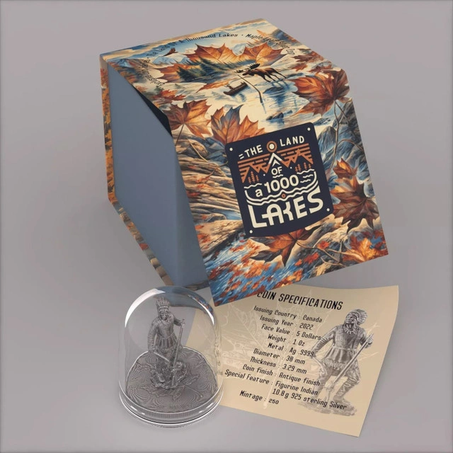 1 Oz Silver Coin 2022 Canada $5 Maple Leaf Indian – Land of a Thousand Lakes This coin has a .925 Silver Indian Figurine that weights 10.8g on top of the .9999 1 oz silver coin. Unique design and Limited Edition. Face Value: $5 Weight: 31.1g / 1 oz Metal: Silver Fineness: .9999 coin Diameter: 38mm Mintage: 250 pcs Limited Edition Finish: Antiqued Certificate: Yes Presentation Case: Yes Country: Canada Year: 2022 Condition: New More Info: Other Cash accepted: Yes