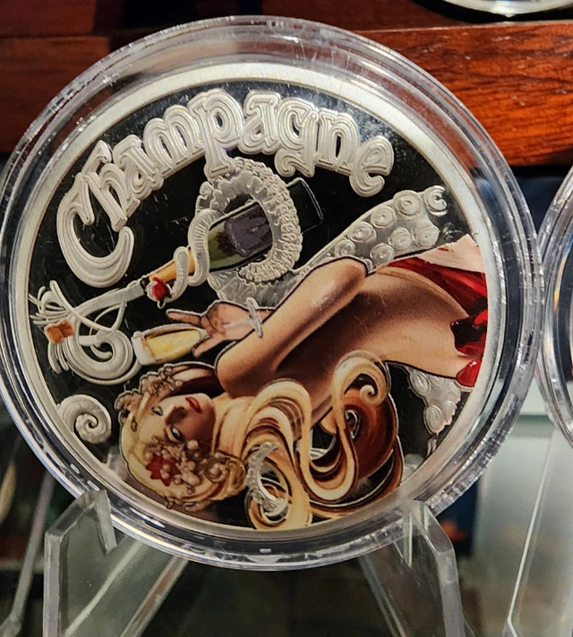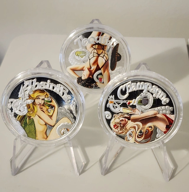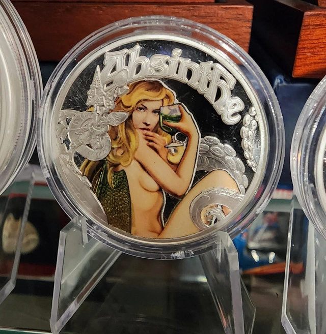 Cthulhu Temptations Colorized 1oz Silver Proof Round - 3 coin set 2022 ECHO CHERNIK - CTHULHU TEMPTATIONS: ABSINTHE - 1OZ SILVER COLLECTIBLE FINE SILVER COINS BY ECHO CHERNIK Absinthe Cthulhu Tequila Cthulhu Champagne Country: United States Period: Federal Republic (1776-Date) Type: Silver Bullion Years: 2022 Mint: Osborne Mint - Cincinnati, Ohio Composition: .999 Silver Diameter: 38mm Weight: 31.1g Edge: Reeded with Serial Number Mintage: 5,000 Condition: New - Mint Packaging Condition: New More Info: Other Cash accepted: Yes Cashless payment: Yes For Sale By: Owner Curbside pick up: Yes