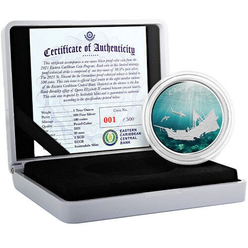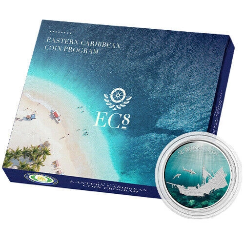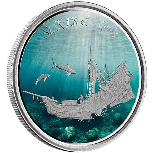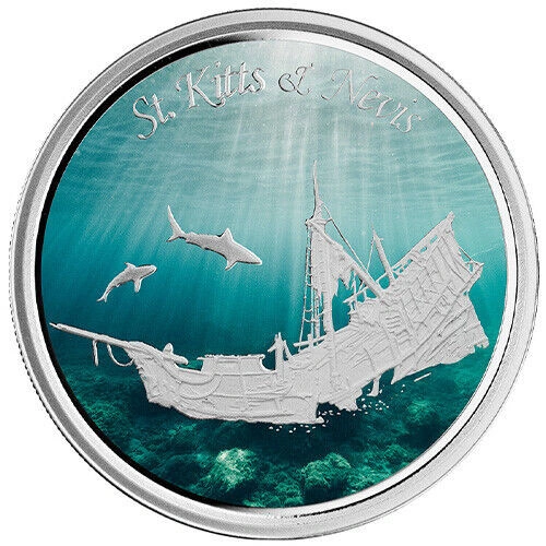 2021 1 oz Colorized EC8 Silver St. Kitts and Nevis Coin. Delivered in a presentation box with a Certificate of Authenticity. 4th Release in the EC8 Series! Contains 1 Troy oz of .999 pure silver. Bears a face value of 2 Dollars. The obverse includes an iconic effigy of Queen Elizabeth II. On the reverse side is a shipwreck site in St. Kitts and Nevis. Colorized proof specimen.