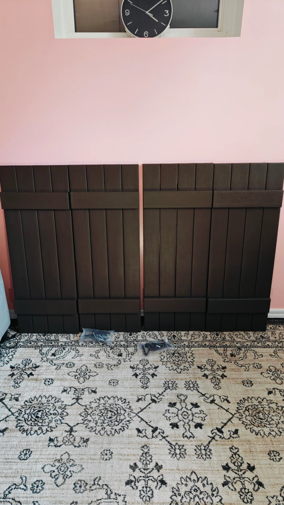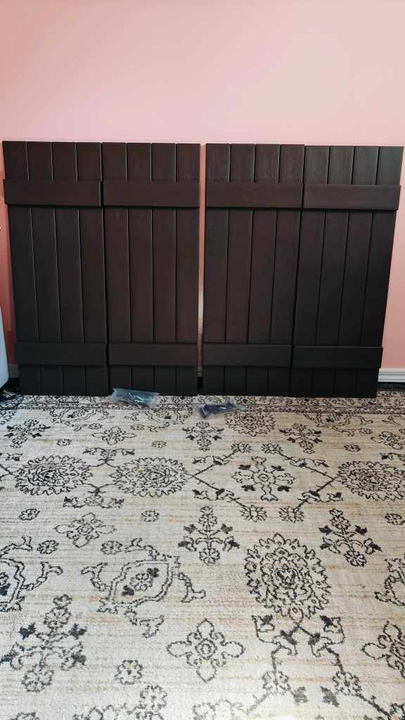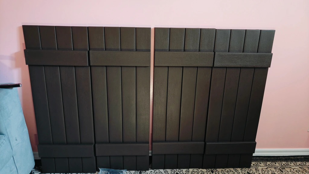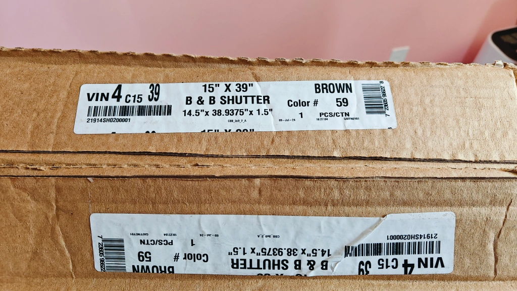 Selling a pair of B & B Shutters in brown. They are 15" x 39". ( 2 pairs - 4 PC's) These shutters are still in their original box!