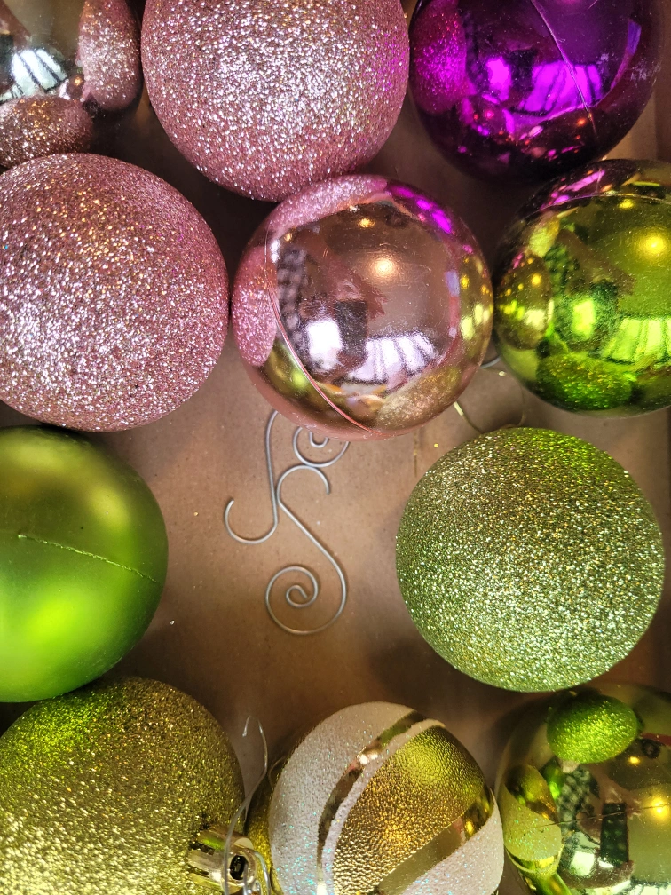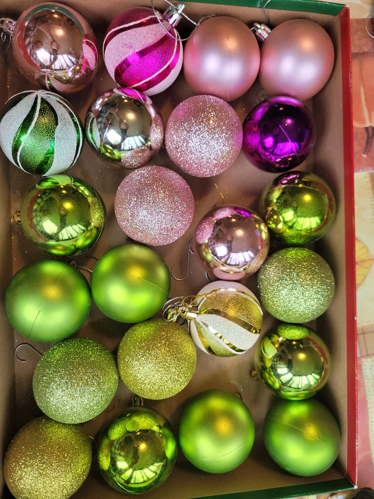Selling a collection of Christmas ornaments in a variety of colours and finishes! There are shiny, glittery, and matte ornaments in different shades of pink, green, purple, and gold. Perfect for adding some sparkle to your Christmas tree this year