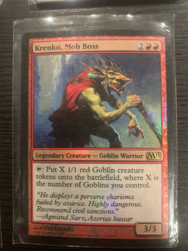 Up for grabs is a themed MTG Goblin Deck, featuring the legendary Krenko, Mob Boss, and Kiki-Jiki, Mirror Breaker. This used deck is ready to overrun your opponents with hordes of goblins and tricky plays. It has been well-loved and cared for, ensuring many more battles to come! Other key cards include Goblin King, Door of Destinies, and Lightning Bolt. * Creature Type: Goblin * Format: Most likely Commander/EDH * Condition: Used, but cards are in great shape Based on the rarity and collectibility of these cards, I'm asking $250, which is a steal for a deck packed with such iconic goblins. If you're reading this, the goblins are still available for adoption into your MTG collection!