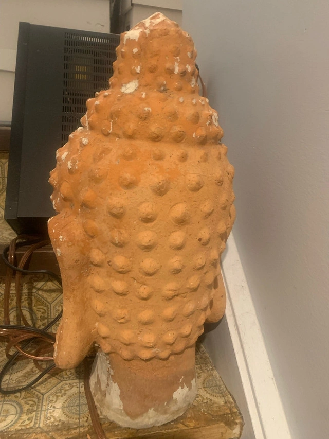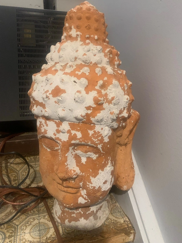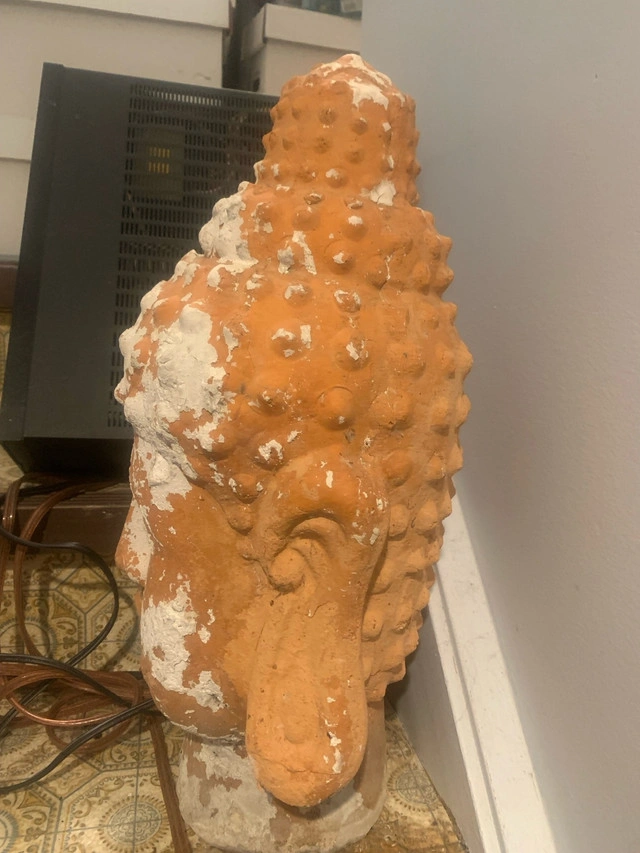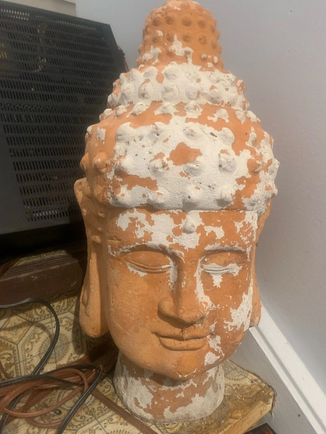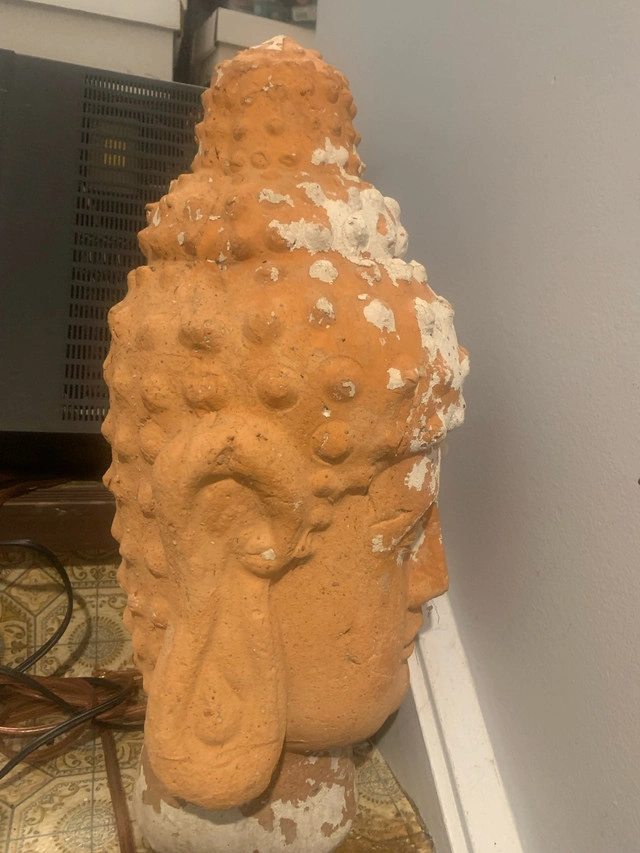 This is a used Buddha head statue with a beautiful patina that gives it a unique, aged appearance. This serene Siddhartha statue is made of terracotta. It is a unique decorative piece with a lot of character. Add a touch of zen to your home or garden with this beautiful piece! If the ad's still up, it's still available!