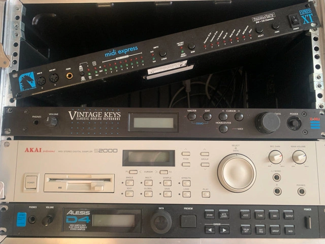 Selling my vintage keyboard synth rack and hard case, perfect for musicians and collectors interested in classic sound modules and MIDI devices. This used setup includes: an Alesis D4 drum module, an Akai S2000 sampler, a Vintage Keys module, an Opcode MIDI Express XT interface and a SKB hard case. It's all in great condition, and should all be fully functional for creating those classic 90s techno / dance / ebm / house / whatever sounds! * Alesis D4 Drum Module * Akai S2000 Sampler * Vintage Keys Module * Opcode MIDI Express XT Interface * SKB Hard Case #microKorg can be sold separately Asking $799 OBO for everything. I’ve based this price looking at similar listings from Kijiji and reduced by 25%. If the ad is up, it's available. Don't miss out!