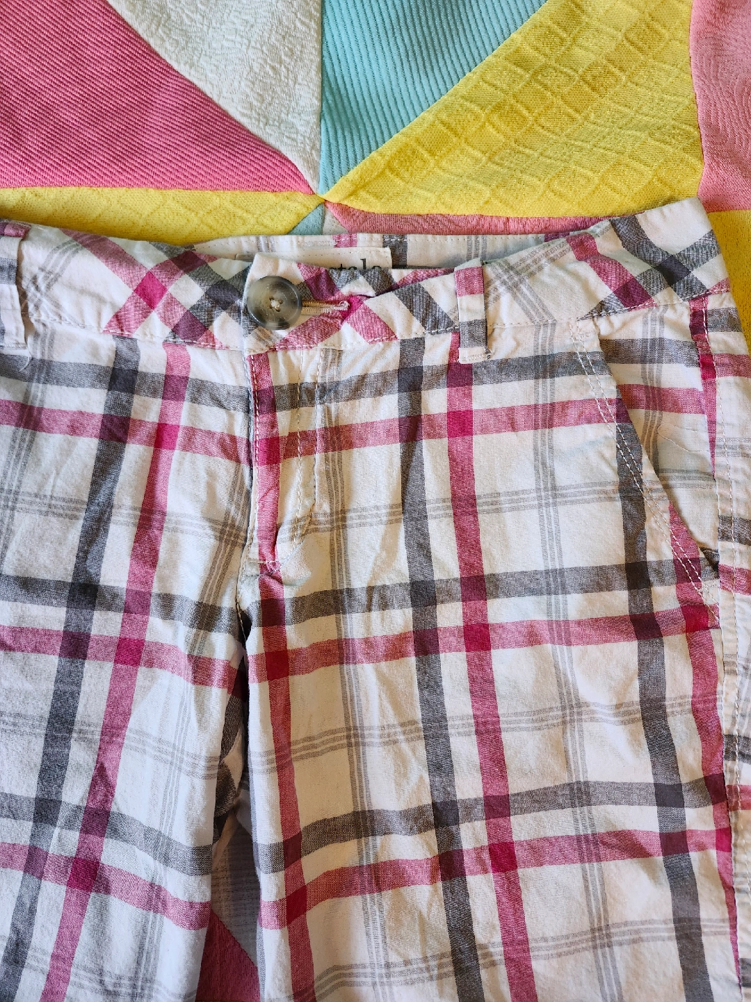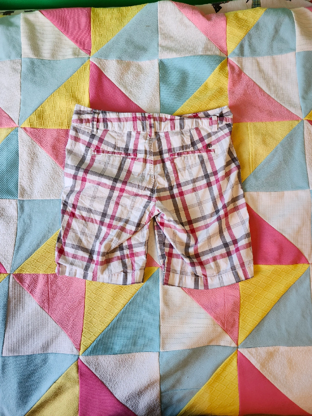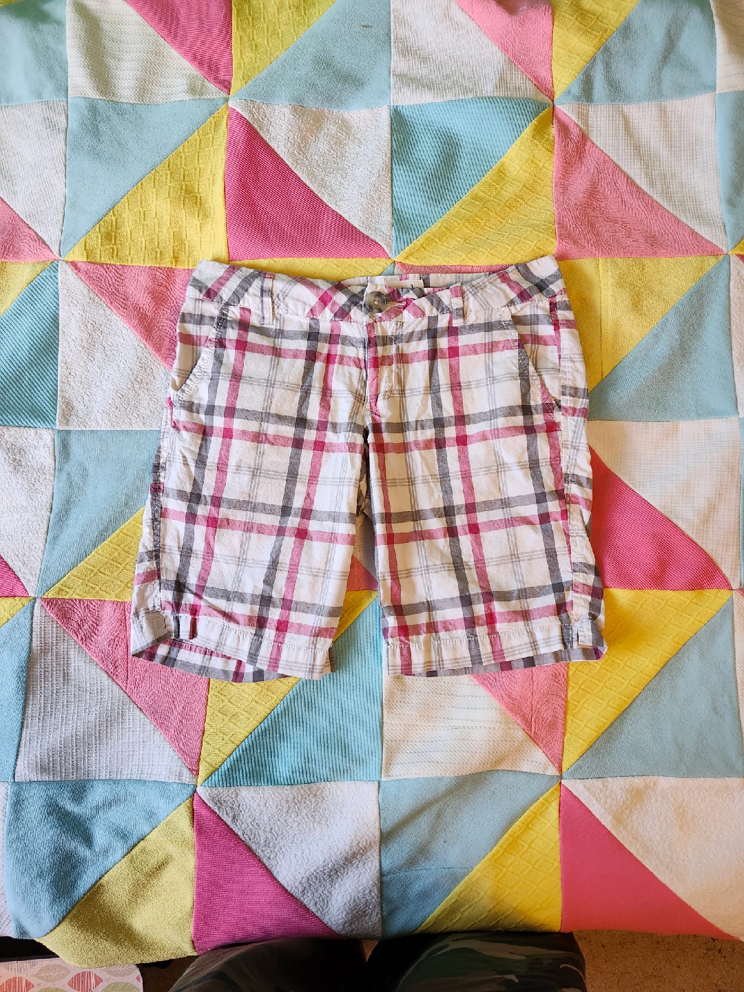 White and pink plaid shorts the most perfect white/grey/pink plaid shorts by Aeropostale. low rise and a little on the long side label size 3/4, waist laying flat is 15.5in, length from top to bottom is just about 16in item is in good used condition with no flaws or stains that I could notice