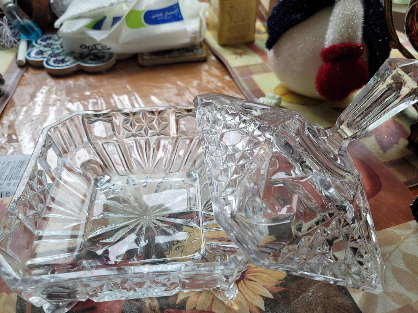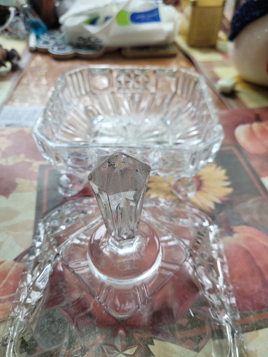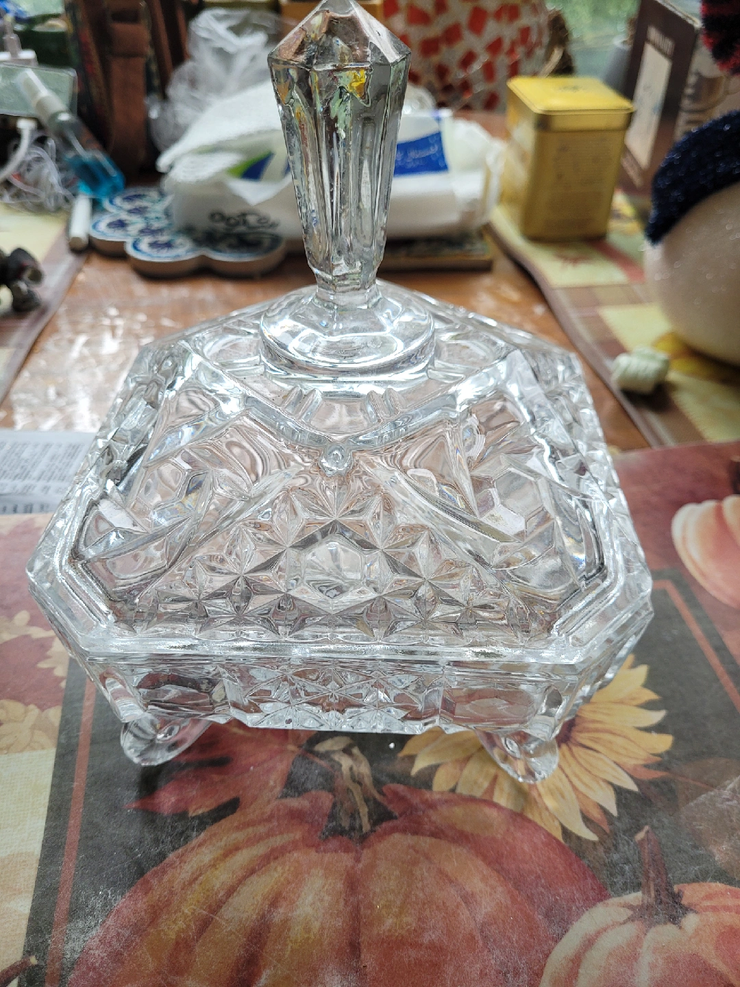 Selling a beautiful crystal candy dish! It has a lovely geometric pattern and a matching lid. Perfect for storing candies, small trinkets, or just as a decorative piece for your home