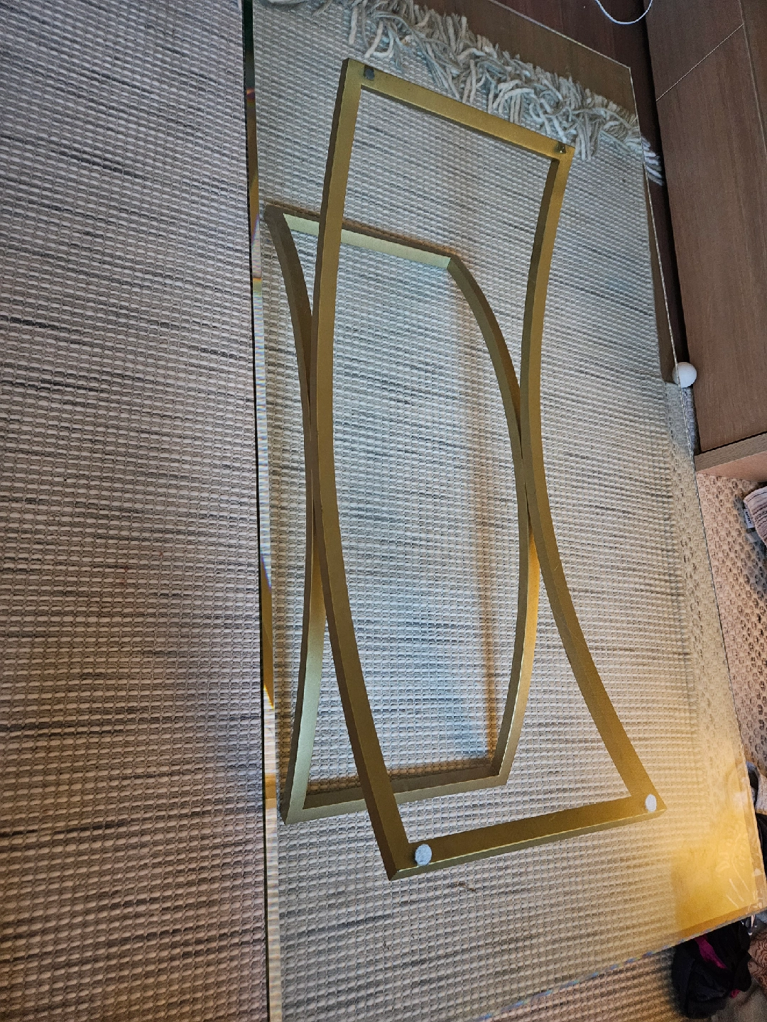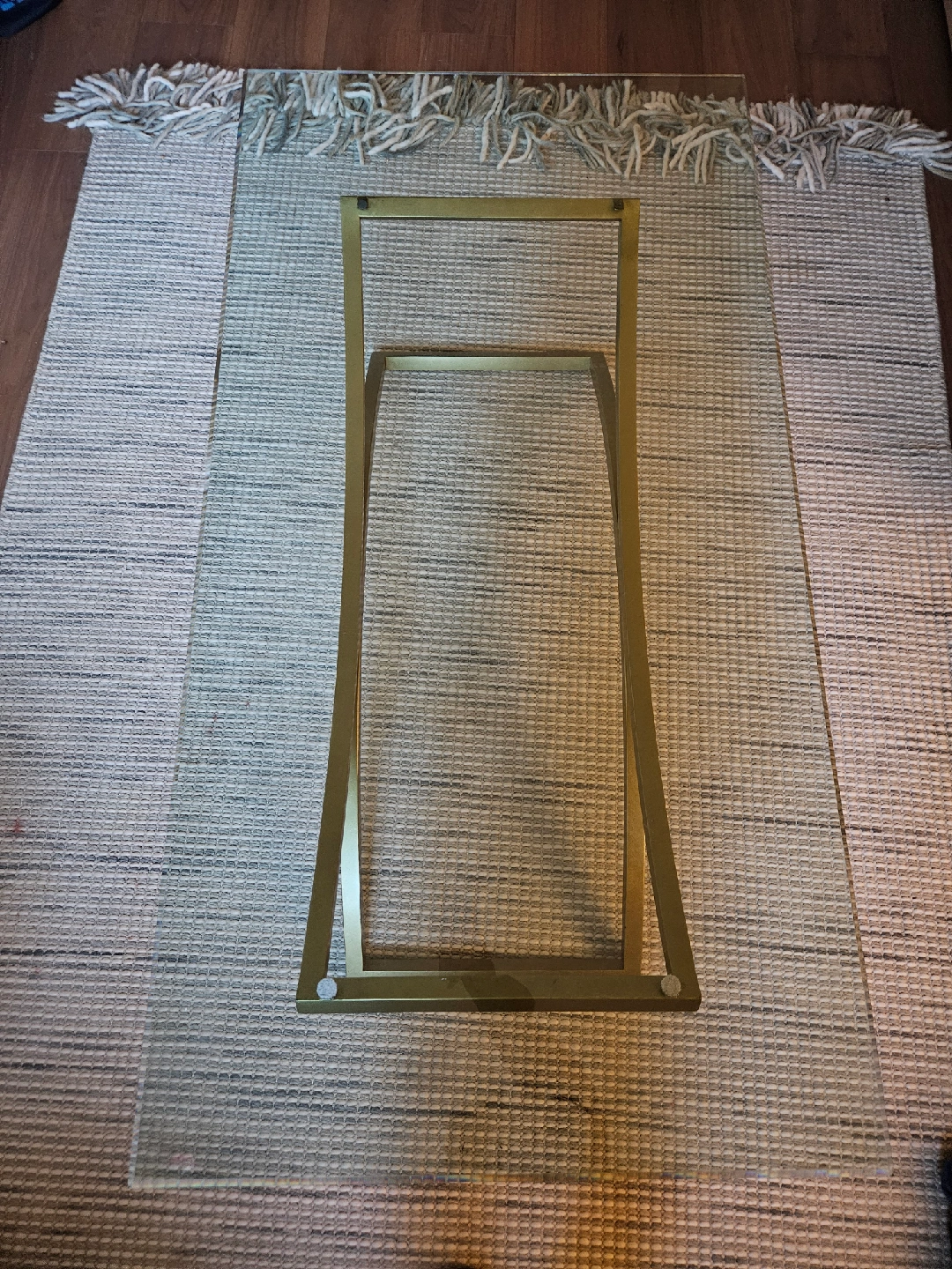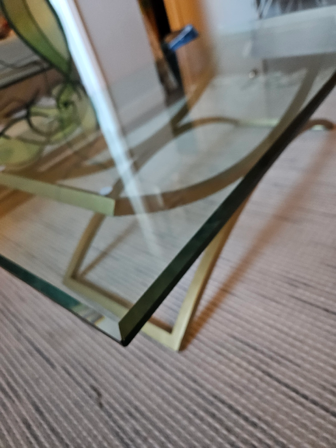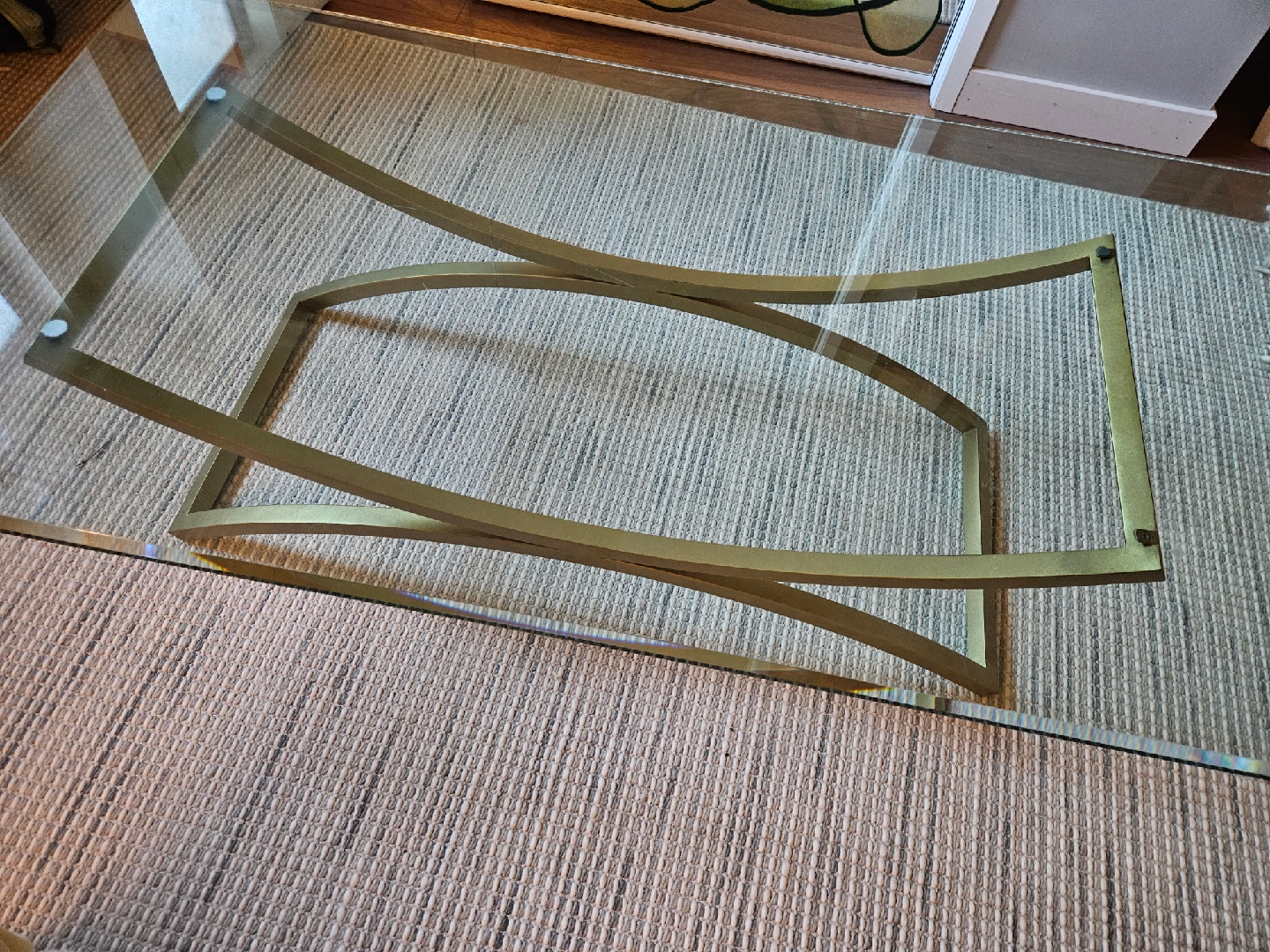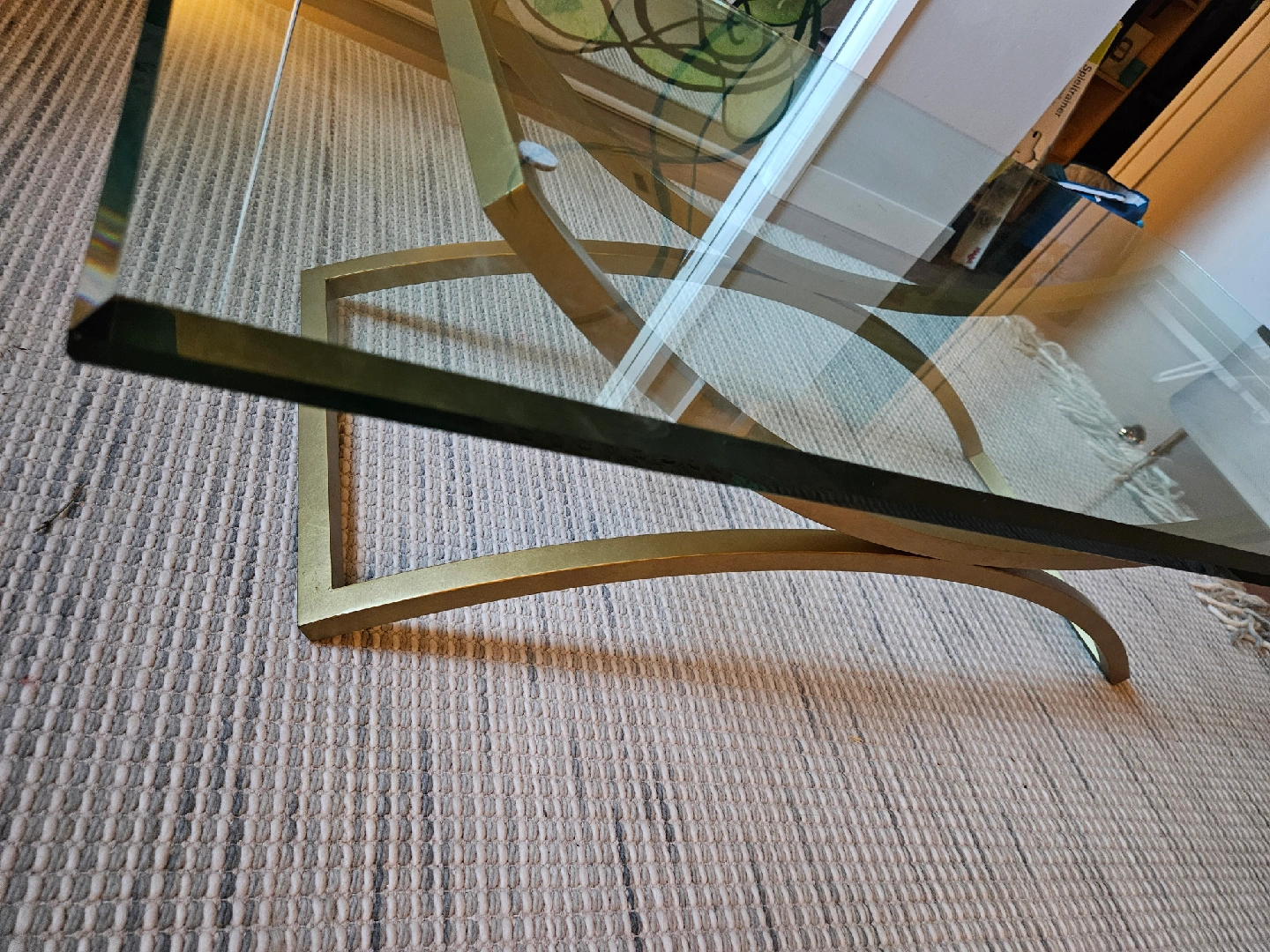 Selling a glass coffee table with a unique gold metal base. It's in great condition and would be a stylish addition to any living room! Solid glass and solid metal, heavy vintage design.