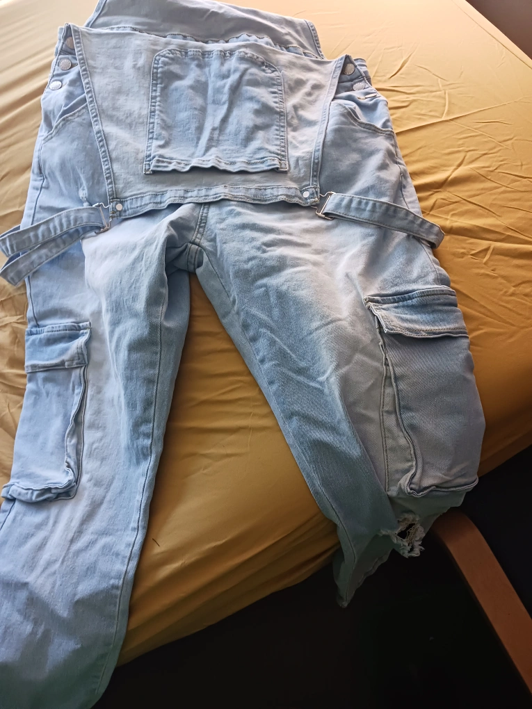 Selling a pair of light blue denim overalls in size XL. They're made of 70% cotton, 28% polyester, and 2% elastane. Cool overall straps that hang for style! They have a unique style and are in excellent condition! Paid $44.
