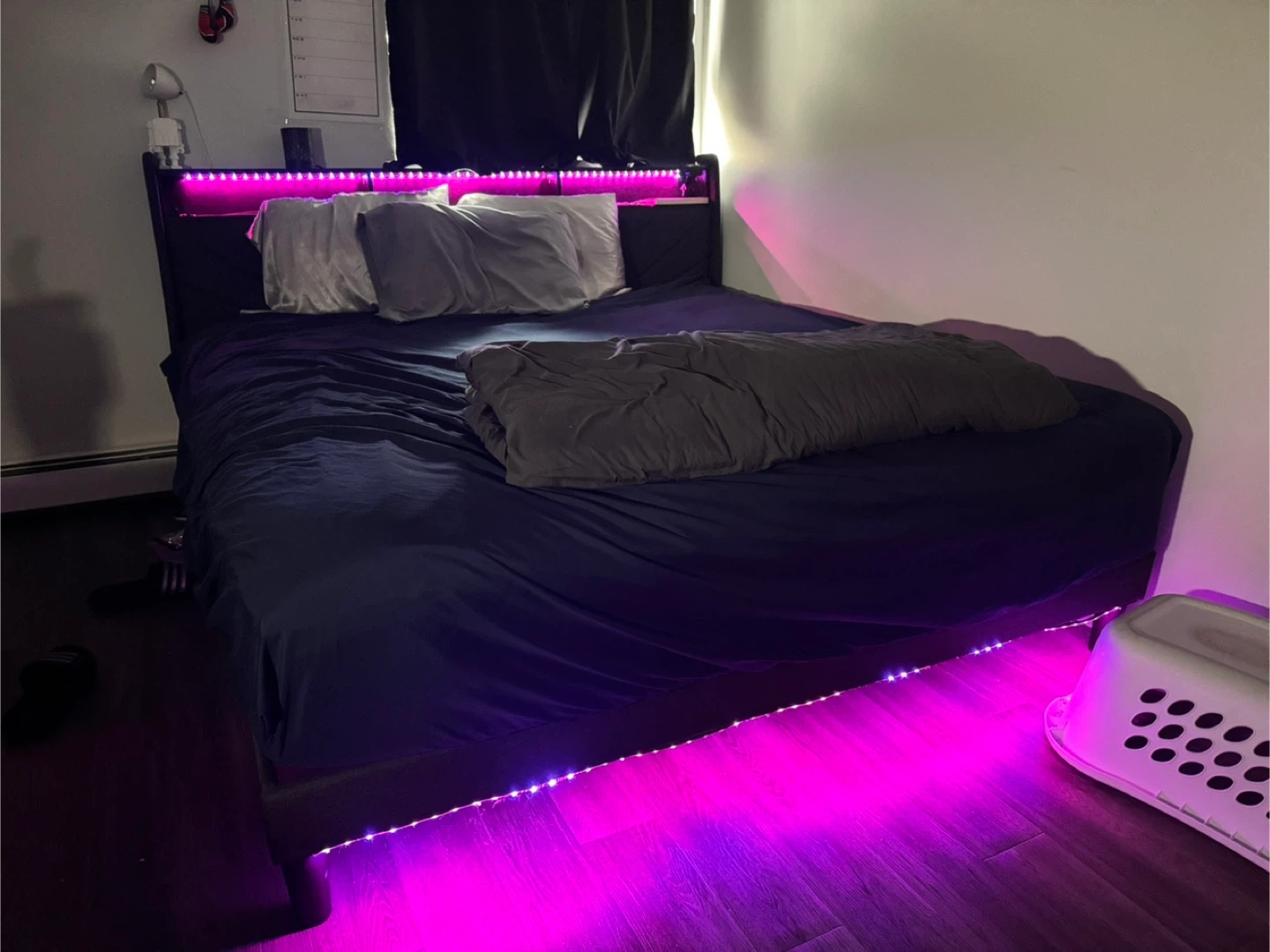 Selling a great quality queen-sized bed frame that comes with built-in LED lights! It's in good condition and ready to add a cool vibe to your bedroom. The LED lights are already installed, so it's super easy to set up and enjoy right away. Condition:4.5/5 ( Only used for 4 months and kept well maintained) Purchased on Amazon for $418.00 The bed would come detached for easy transport The bed frame has metal slats to support the bed and there’s no need to have a box spring with this frame ! Pick up near Oxford Street West