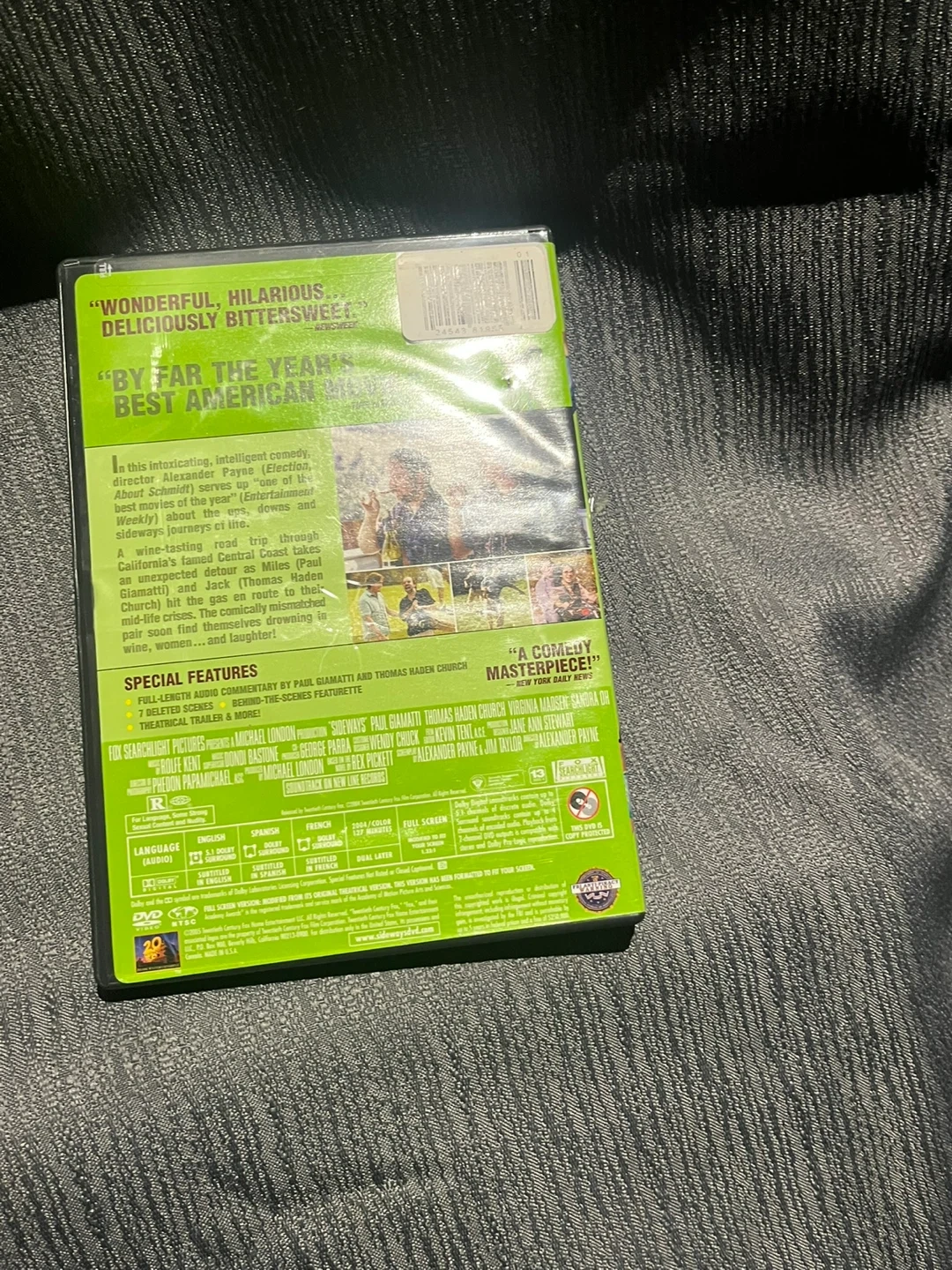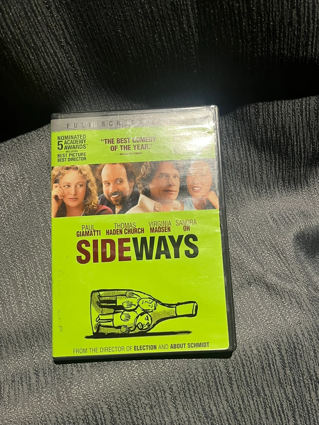 Selling the DVD of Sideways, a hilarious and heartwarming comedy! It follows a wine-tasting road trip through California's vineyards. A great movie for a relaxing evening!