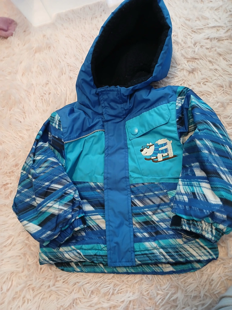 Oshkosh brand , size 24m cute blue winter jacket for kids! It features a fun polar bear design on the pocket and a cozy hood. Perfect for keeping your little one warm during the colder months
