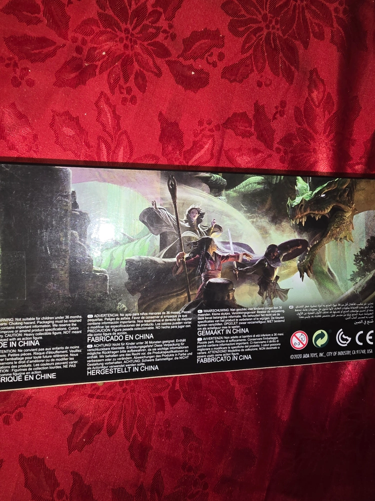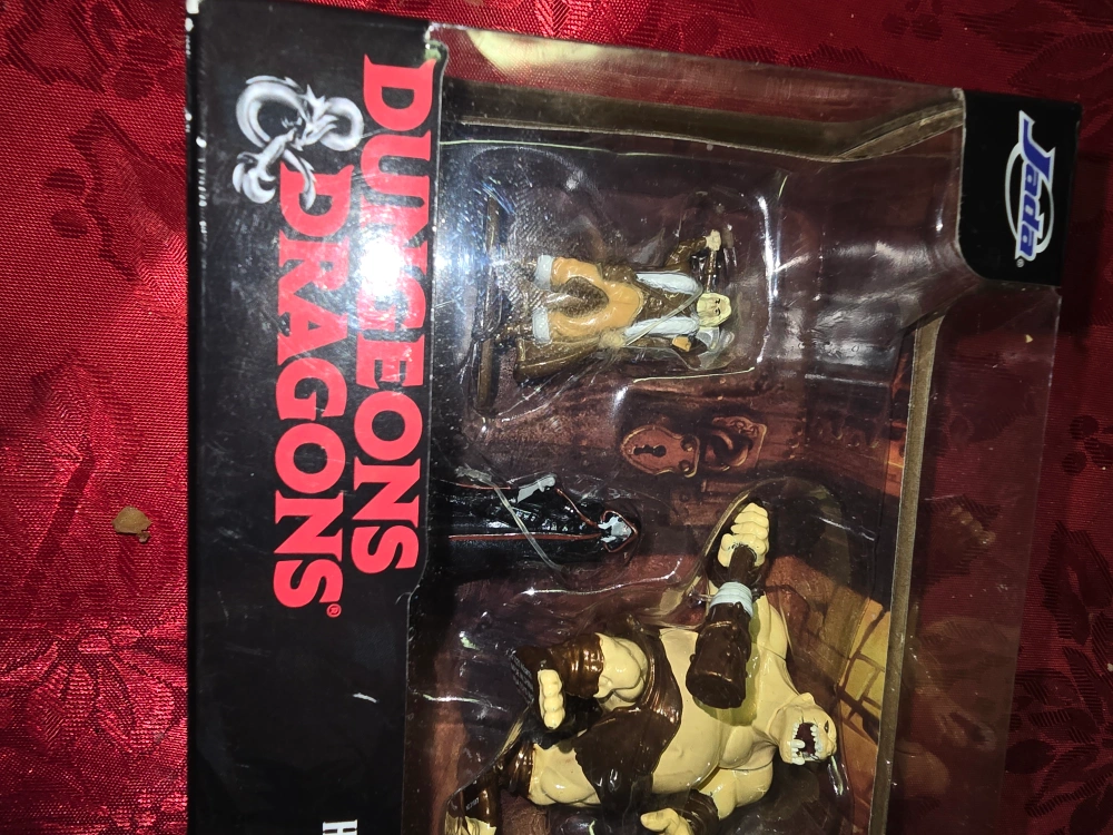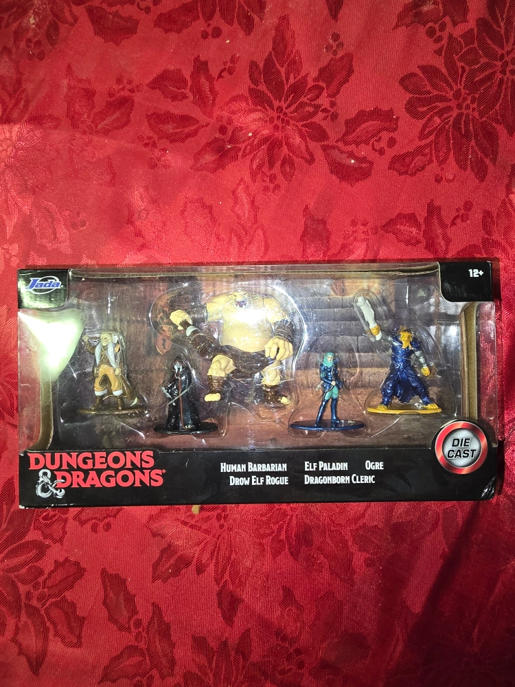 Selling a Dungeons & Dragons die-cast figures set. The set includes a human barbarian, drow elf rogue, elf paladin, ogre, and dragonborn cleric. This set is recommended for ages 12+