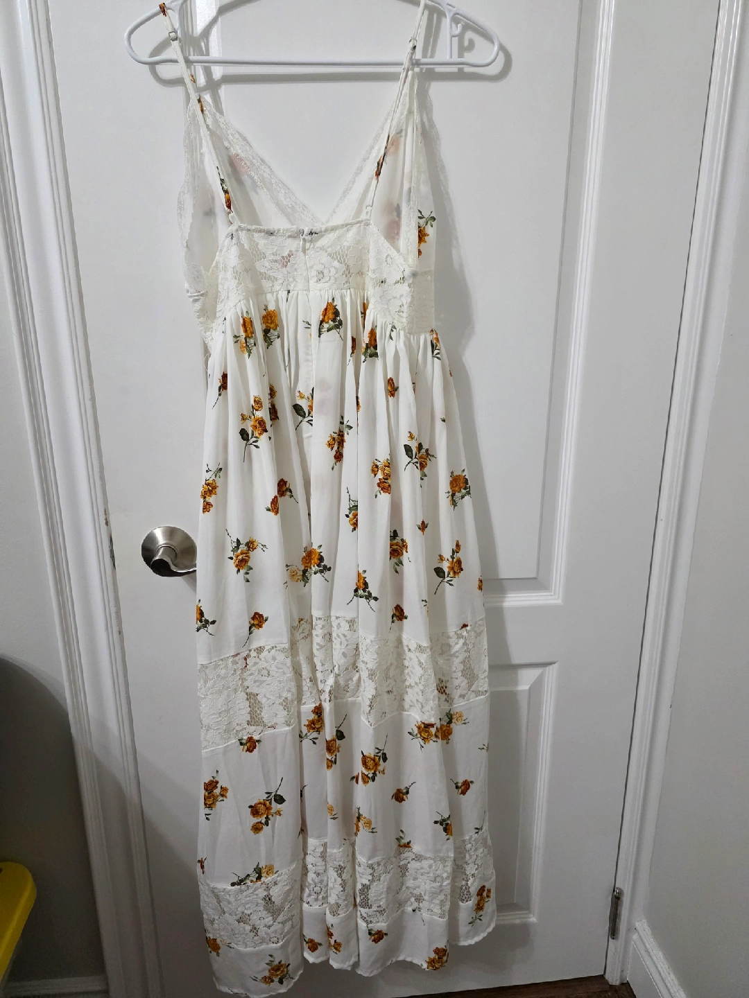 Selling a beautiful floral maxi dress! It's free size and features a lovely white fabric with a delicate floral pattern ,lining and lace detailing. Perfect for summer beach days or special occasions.
