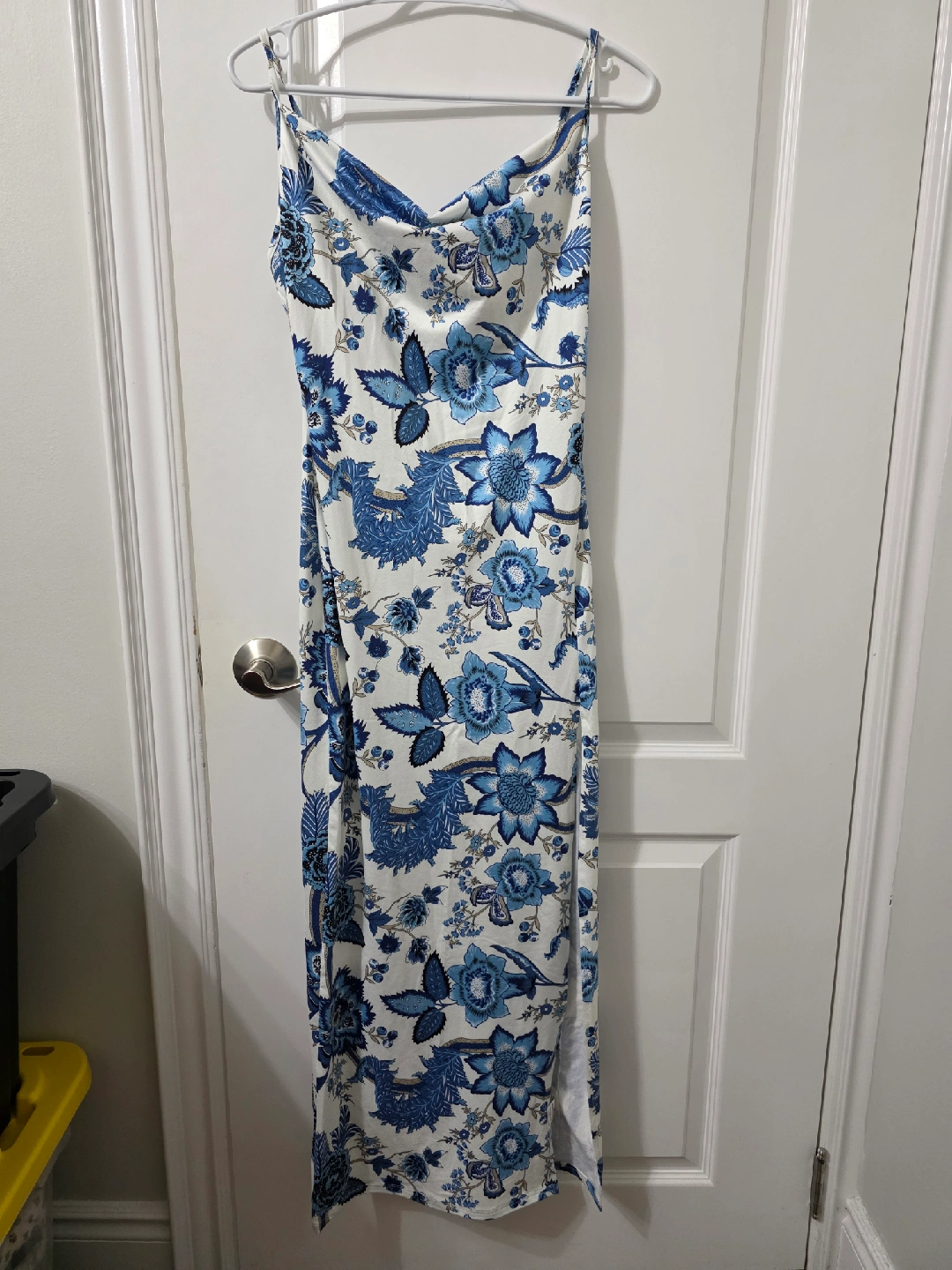 This dress features a beautiful blue and white floral print. It is stretchable and perfect for a summer day or evening out. The dress is in great condition and ready for a new home