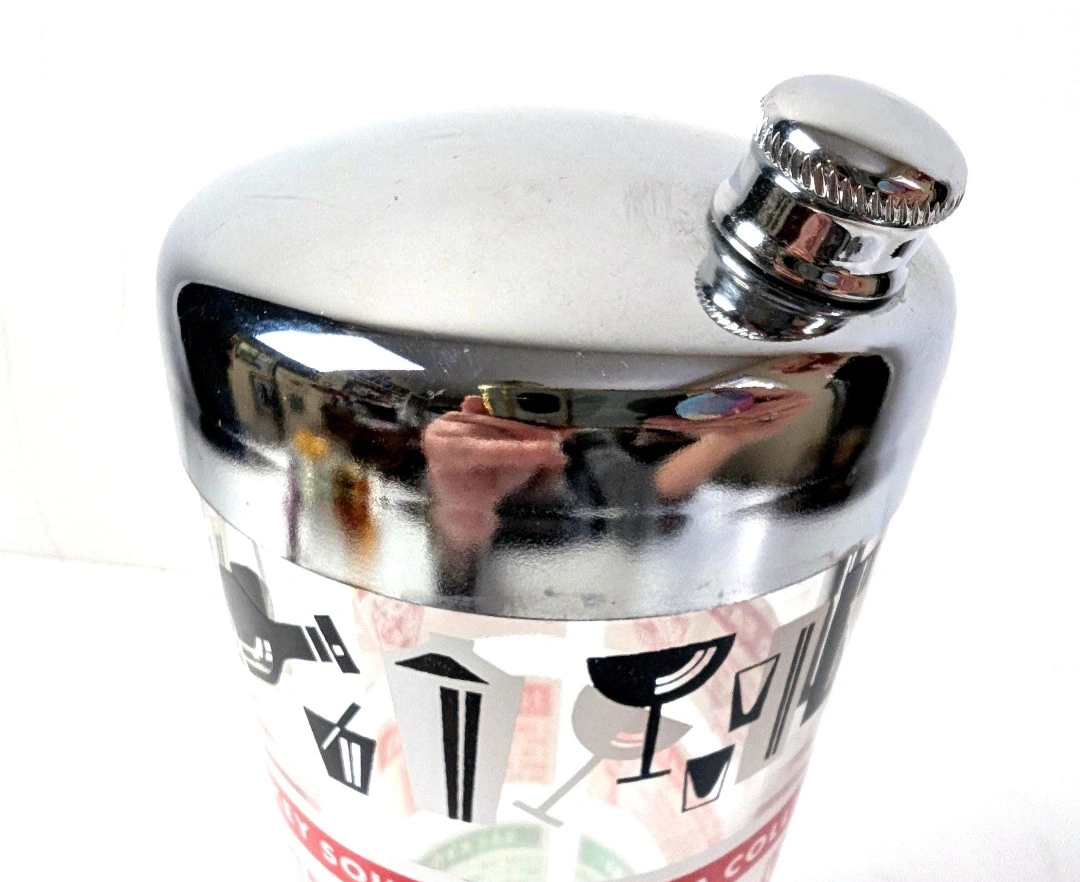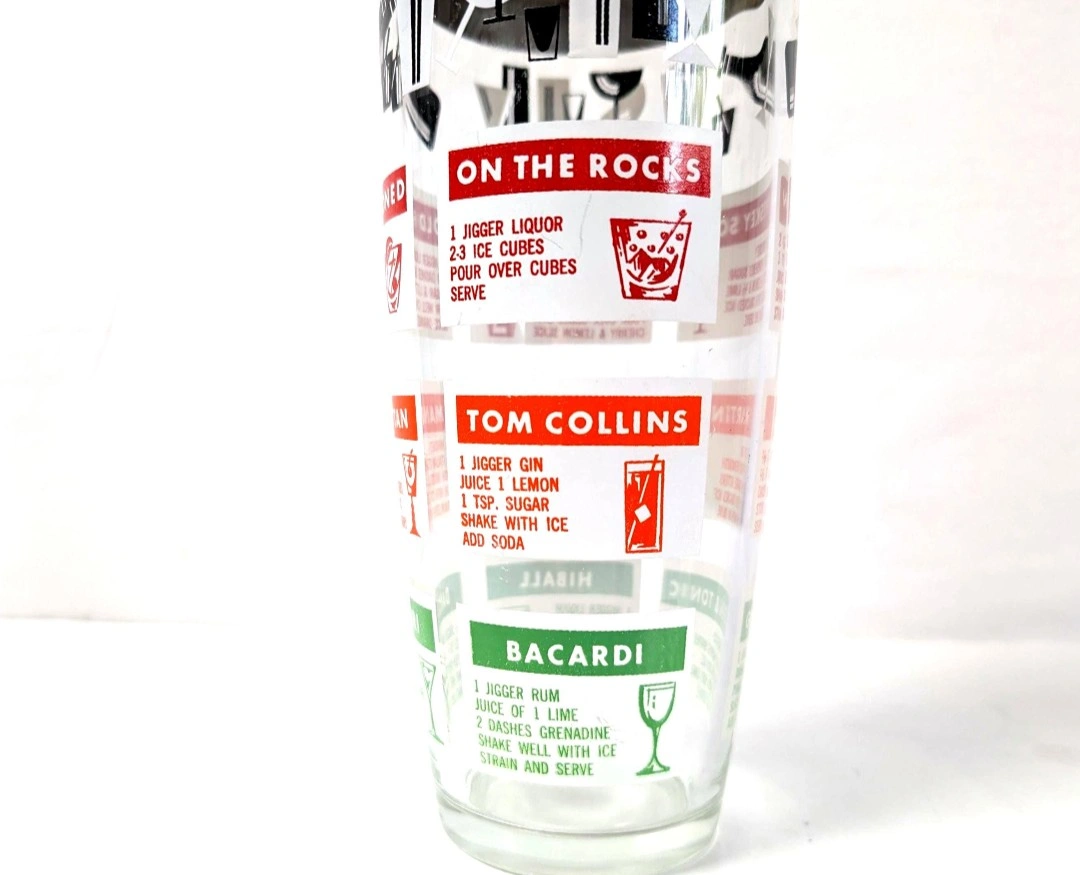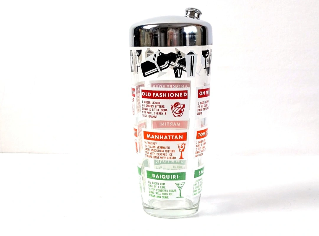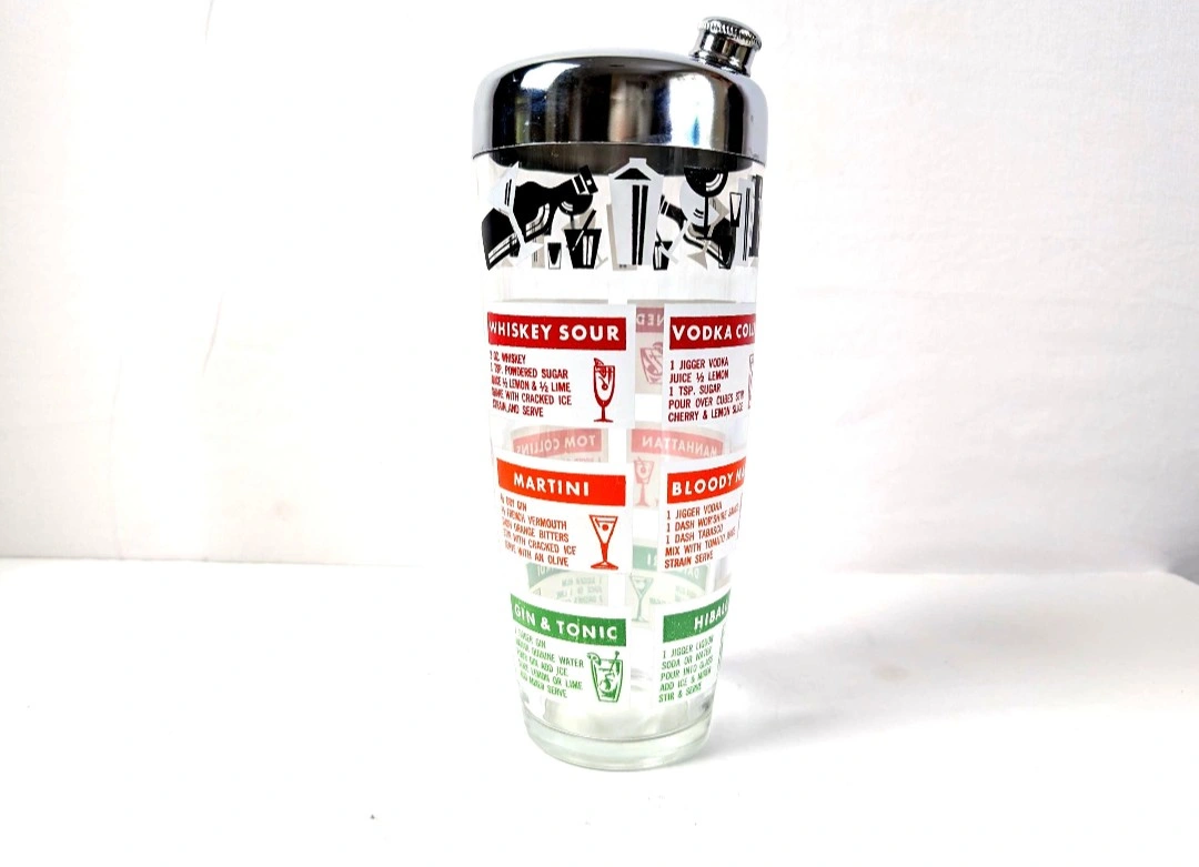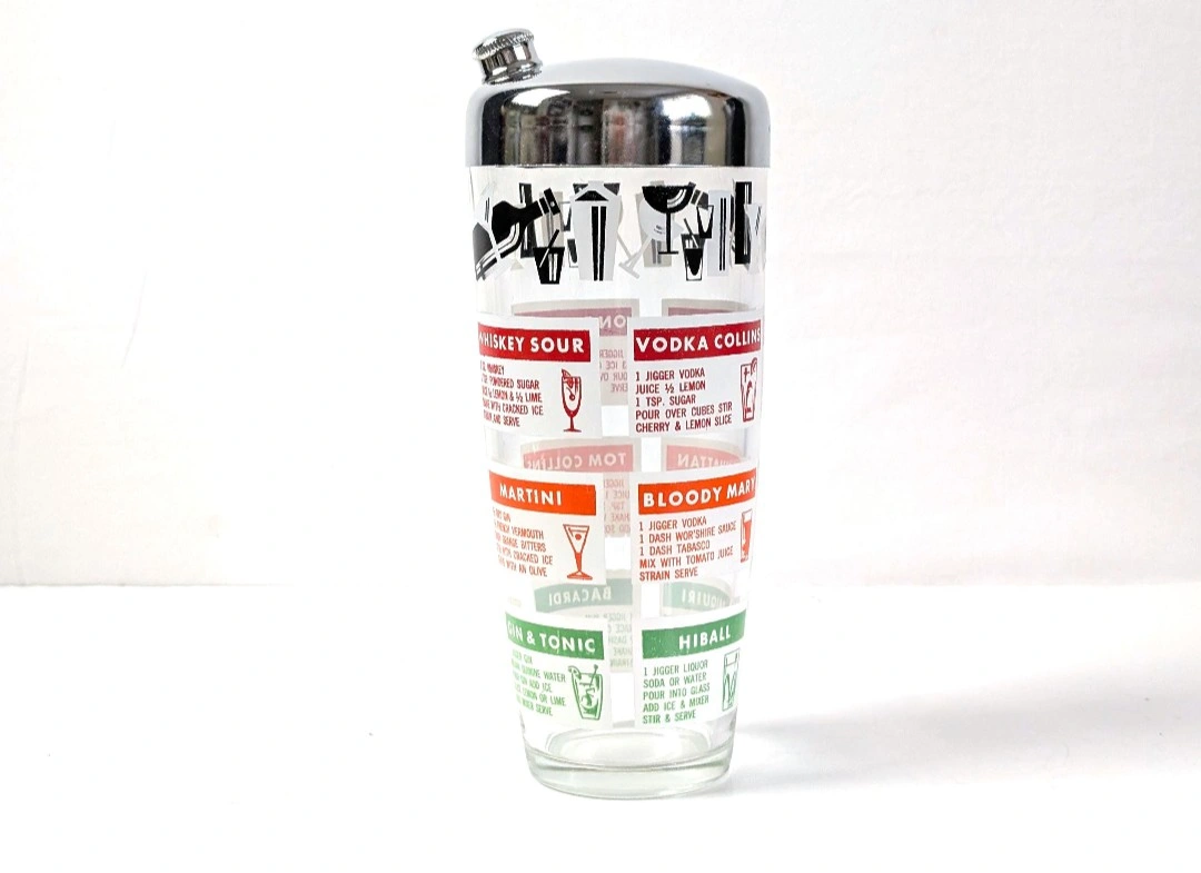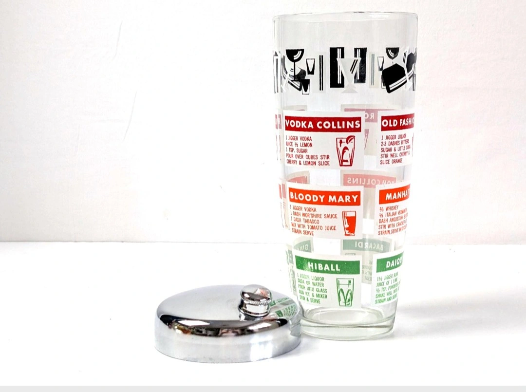 A 'must have' to complete your retro barware. Glass cocktail shaker with chrome plated lid, and screw on/off spout. Retro cocktail graphics along with their recipes. Measures approximately 8.25 inches in height, and 3.75 inches in diameter. Great vintage condition. Excellent retro appeal. π PICK UP TOWNLINE HWY 2 AREA π CASH is preferred please βΊοΈ Thanks for looking π©΅