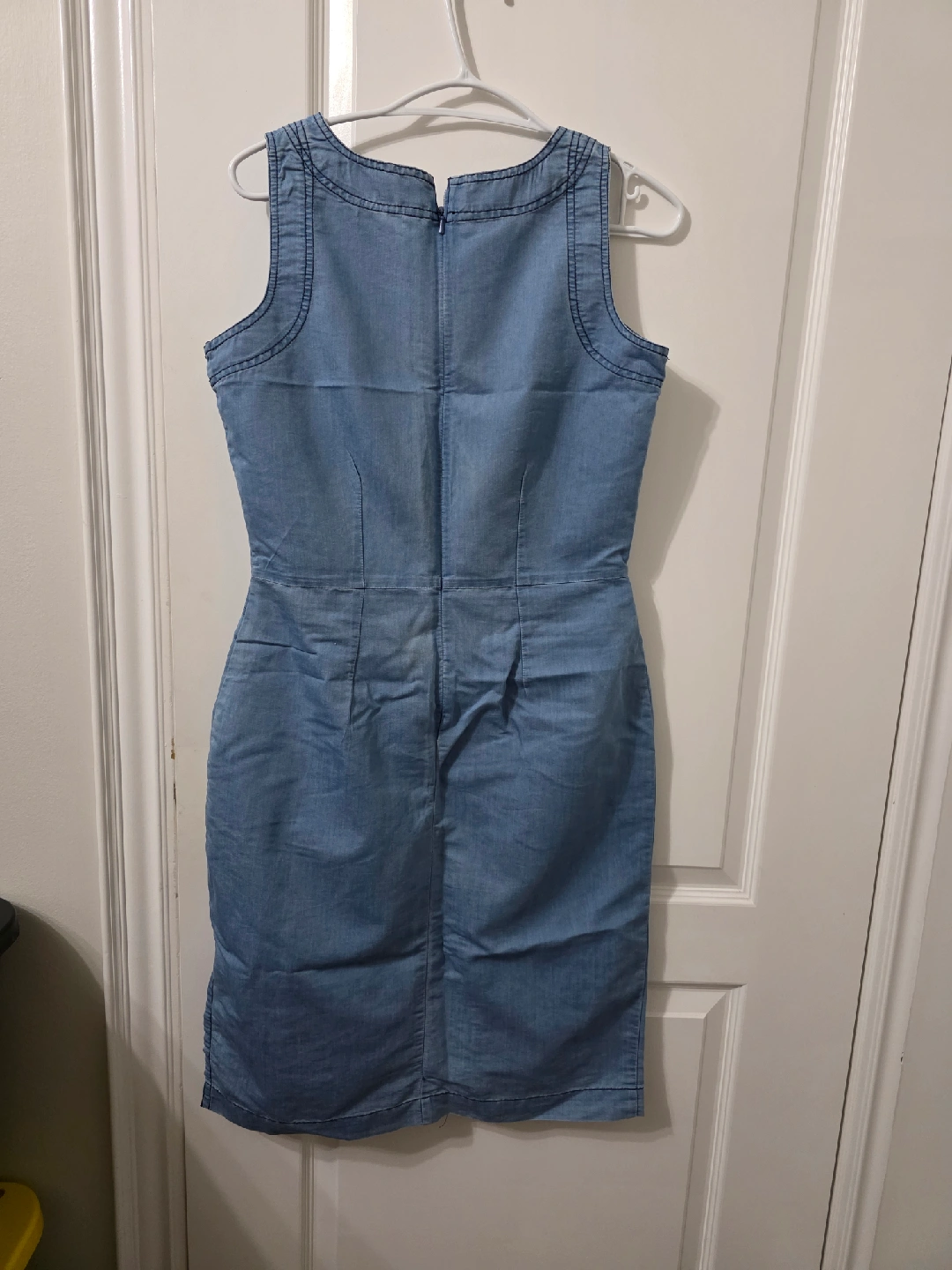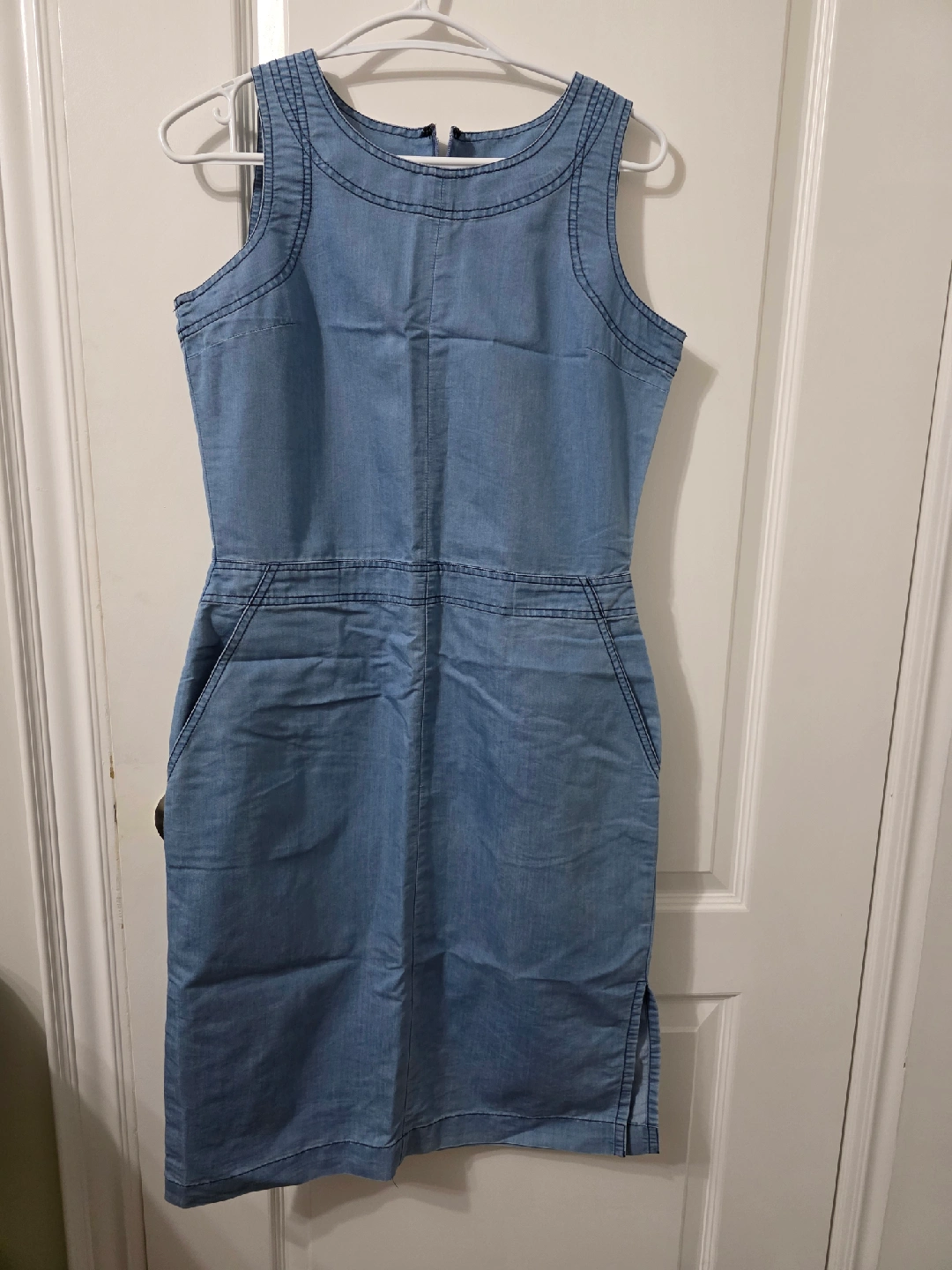 Here's a lovely denim dress! It's sleeveless and perfect for warmer weather. The dress has a nice, classic denim look and is in great condition. It would be a great addition to your wardrobe!