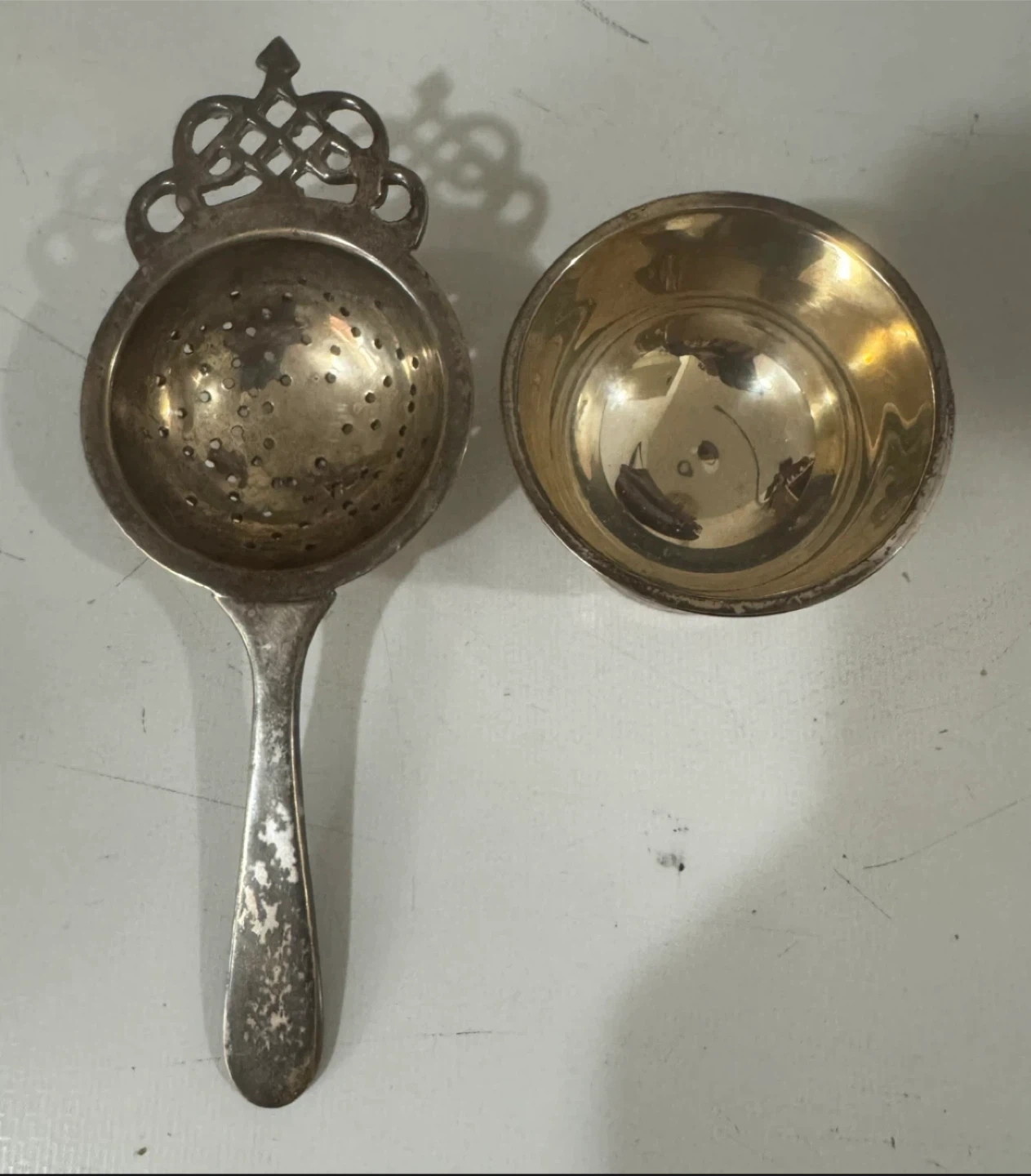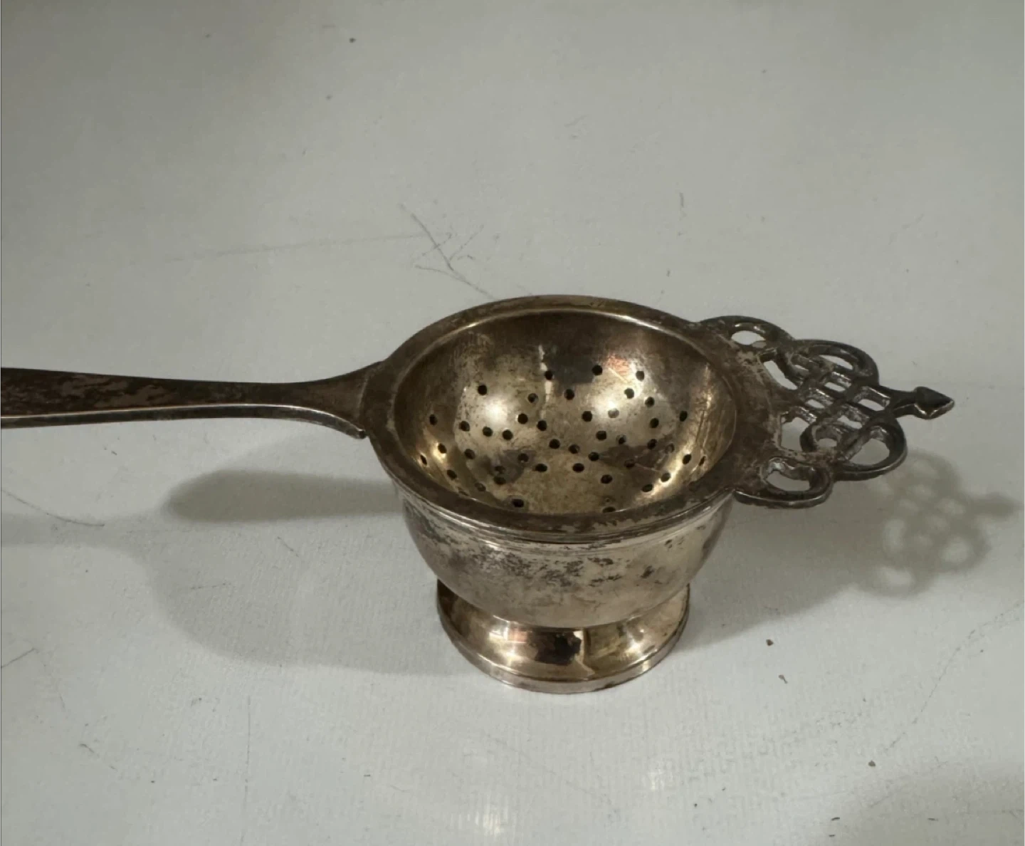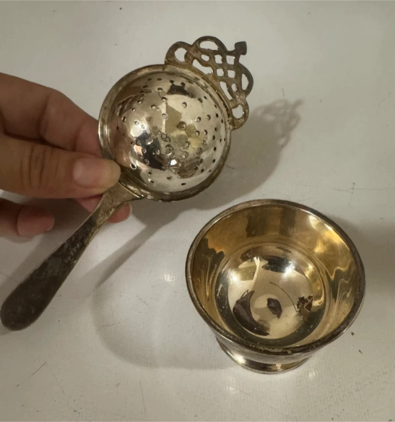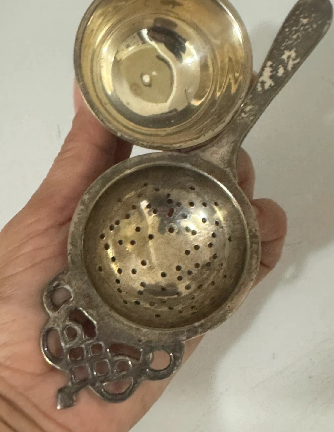 Here's a vintage silver tea strainer with a drip bowl. It has a beautiful, ornate design on the handle and a matching drip bowl to catch any drips. It shows some signs of wear, adding to its vintage charm. Perfect for tea lovers or as a unique addition to your kitchen collection! Pick up near Lawrence and Keele