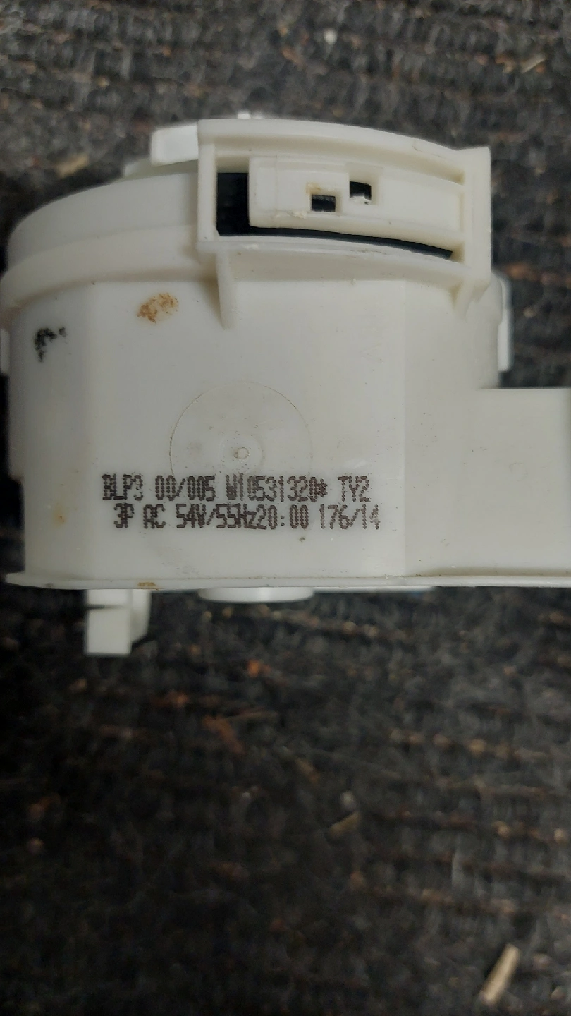 Selling a W10531320 dishwasher machine part. It's white and has the following information printed on it: BLP3 00/005 W10531320* TY2, 3P AC 54V/55Hz20:00 176/14