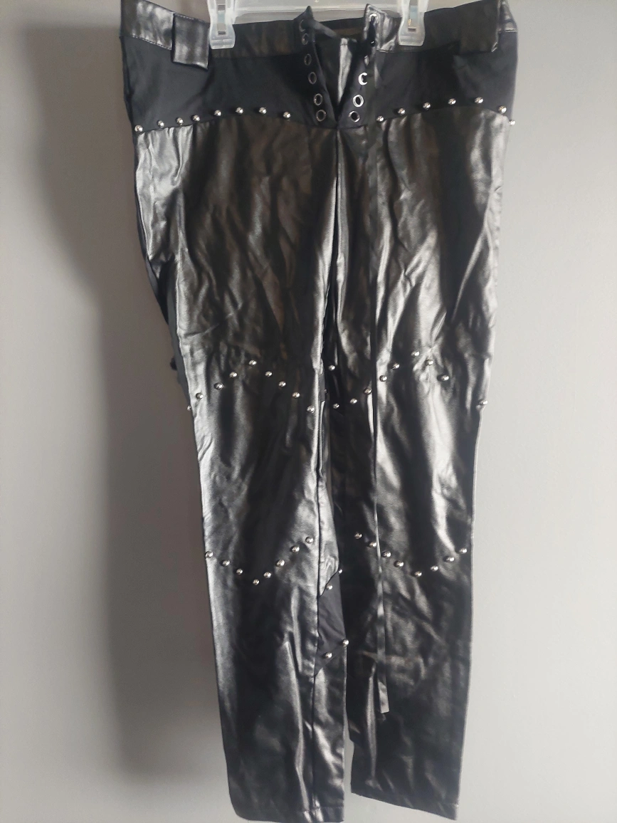 Selling a pair of black pants with PU and studded detailing, tie front and medium stretch They have a unique design and are in good condition. Perfect for adding a bit of edge to your wardrobe! missing a stud or two. not meant for every day wear.