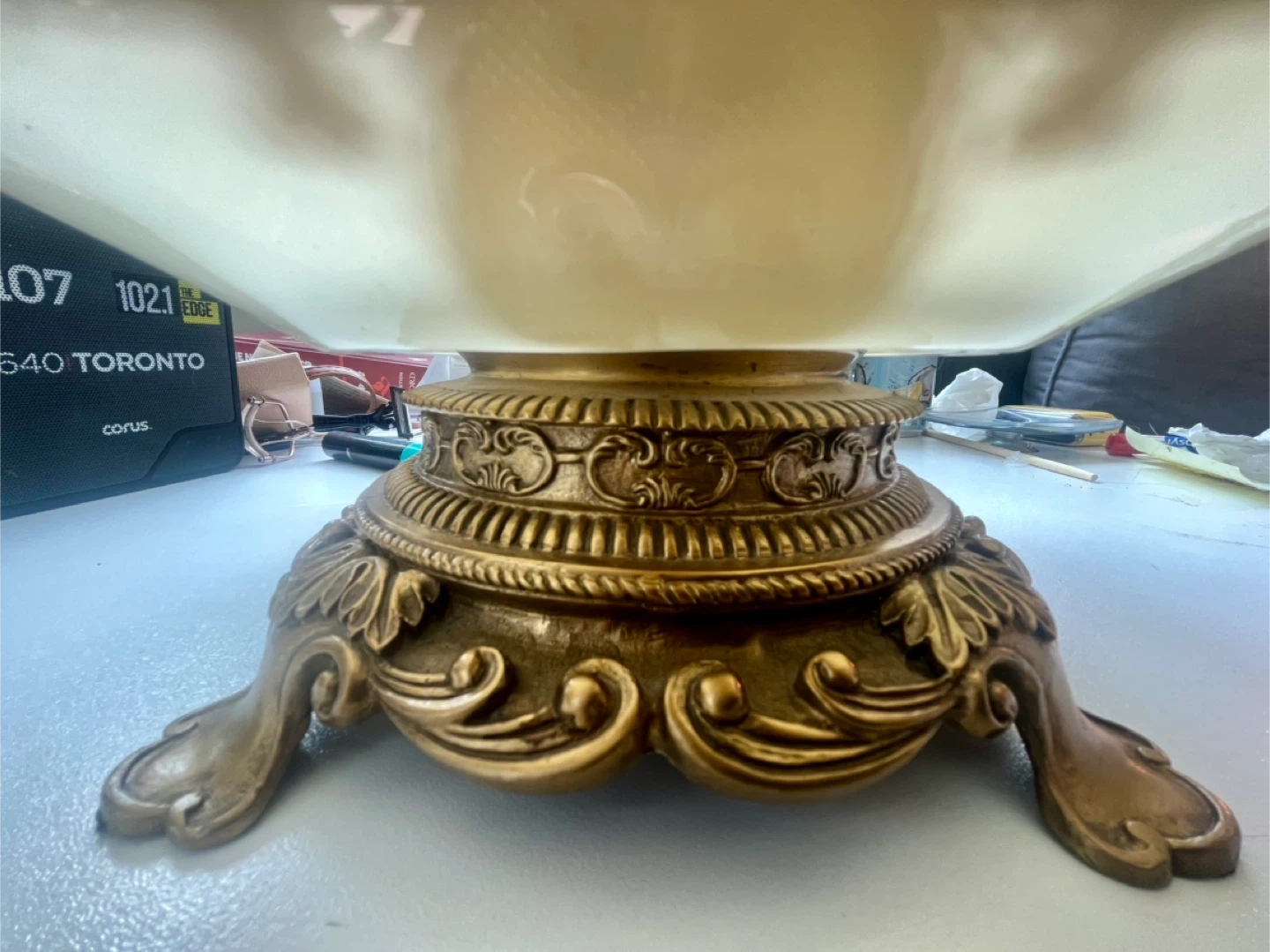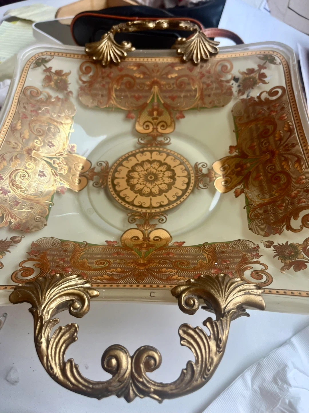 Selling a beautiful vintage decorative glass tray with ornate gold-tone handles and detailing. It's perfect for adding a touch of elegance to your home decor or for serving guests in style. The tray is heavy and in great condition and ready for a new home! Pickup downtown and cash only!