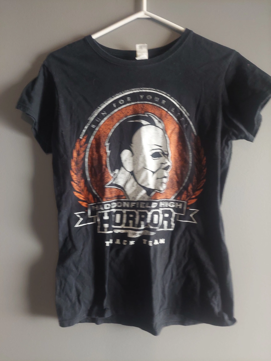 Selling a black t-shirt with a graphic print featuring Michael Myers and the text "Haddonfield High Horror Track Team"! It's in good used condition and perfect for any horror fan