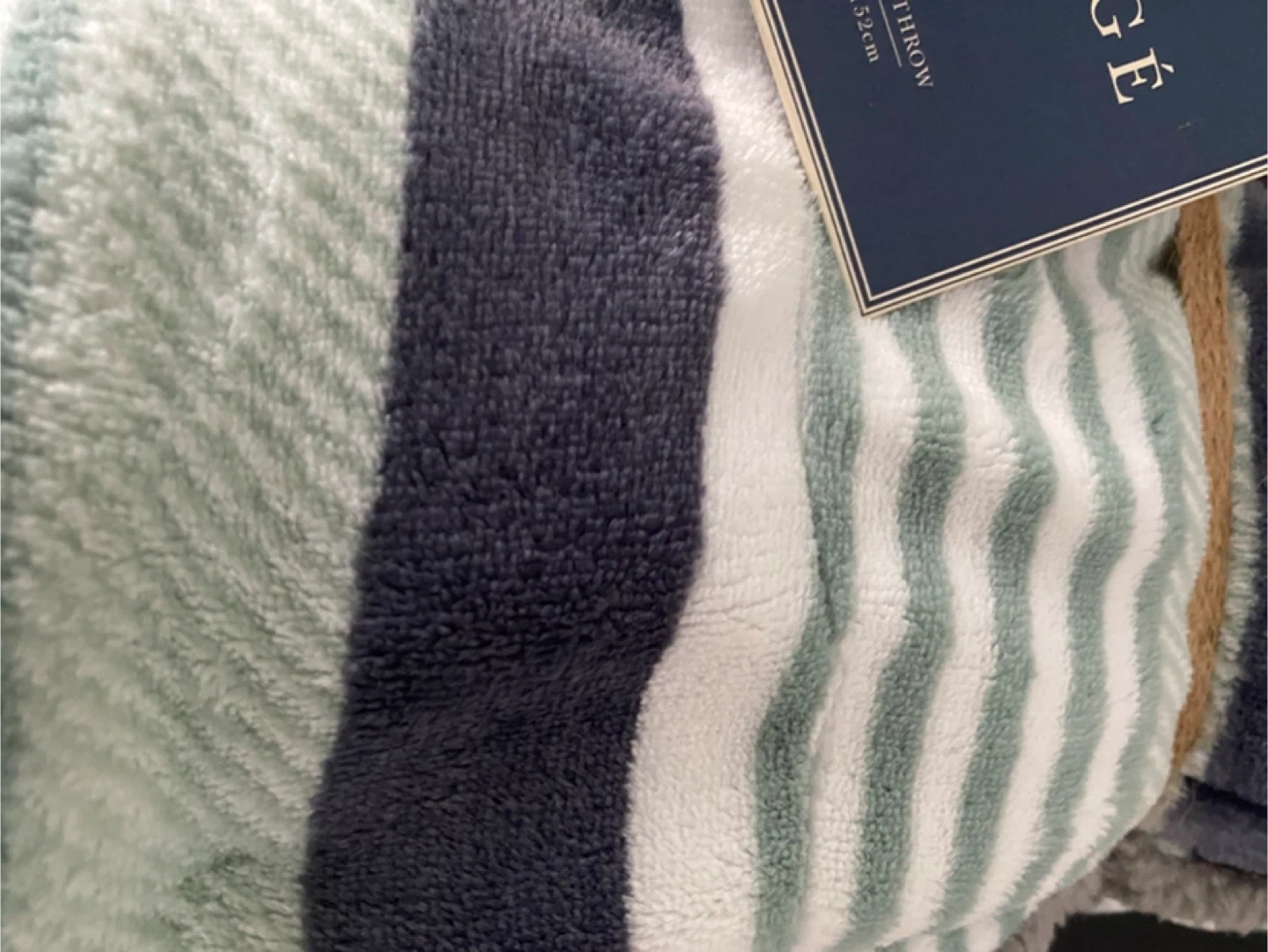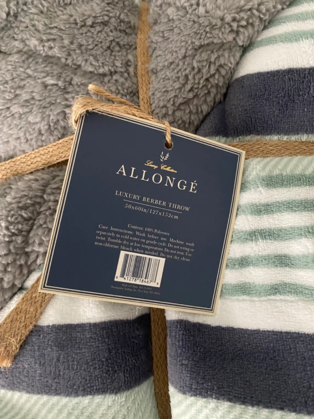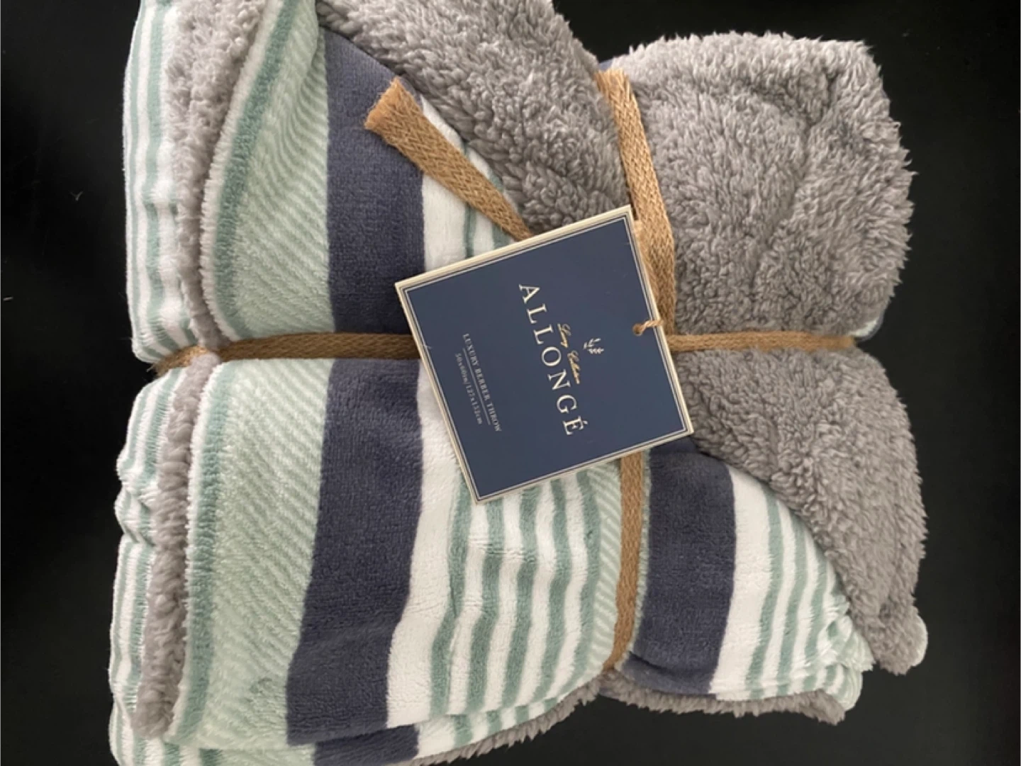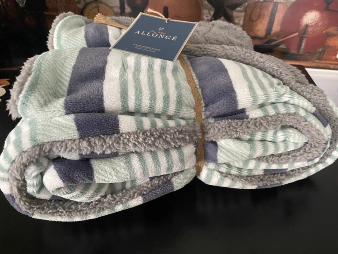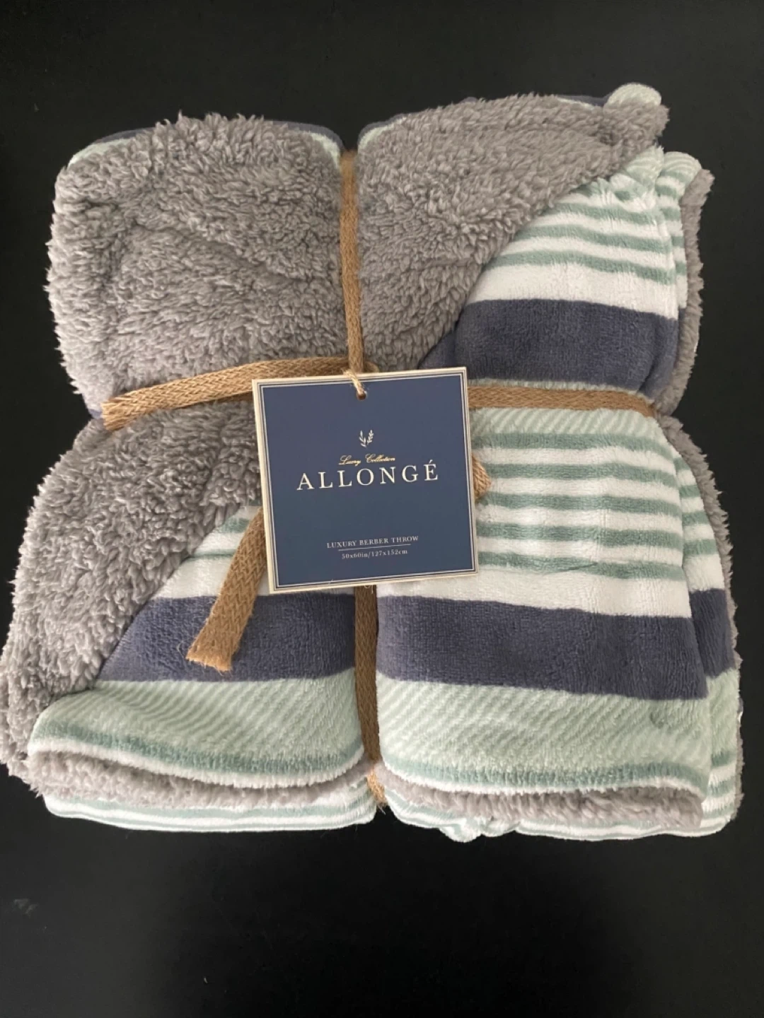Snuggle up with this super cozy Allongé Luxury Berber Throw! It's 50x60 inches (127x152cm) Perfect for adding a touch of warmth and style to your home. Reversible, grey on one side and green, white and blue stripes on the other side. Super soft and warm! Tags on! Never used. Excellent Condition! Cash and pick up only, Cawthra and Lakeshore area in Mississauga.