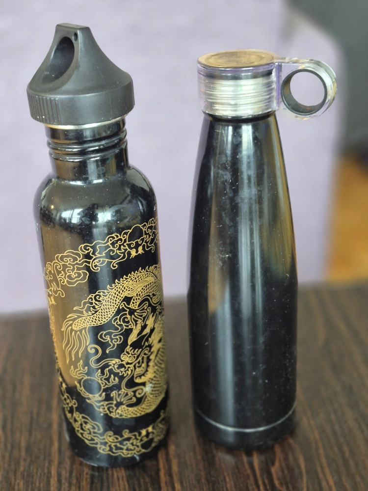 Selling two water bottles! One is black with a gold dragon design, and the other is plain black. Both are in good condition and ready for a new home