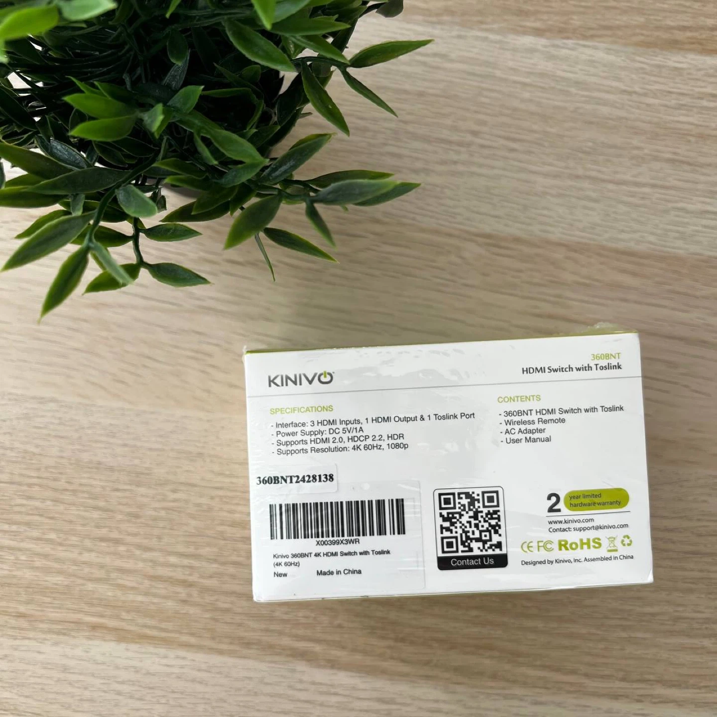 Selling a brand new Kiniwo 360BNT HDMI switch with Toslink! It comes with the following: - 3 HDMI inputs, 1 HDMI output & 1 Toslink port - Supports 4K 60Hz, 1080p resolution - Wireless remote - AC adapter - User manual It also has a 2-year limited hardware warranty