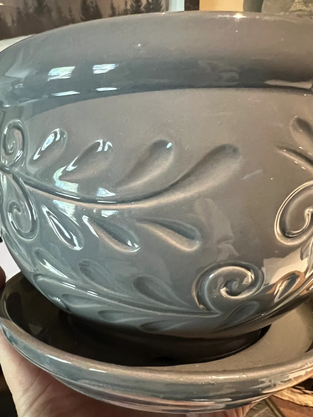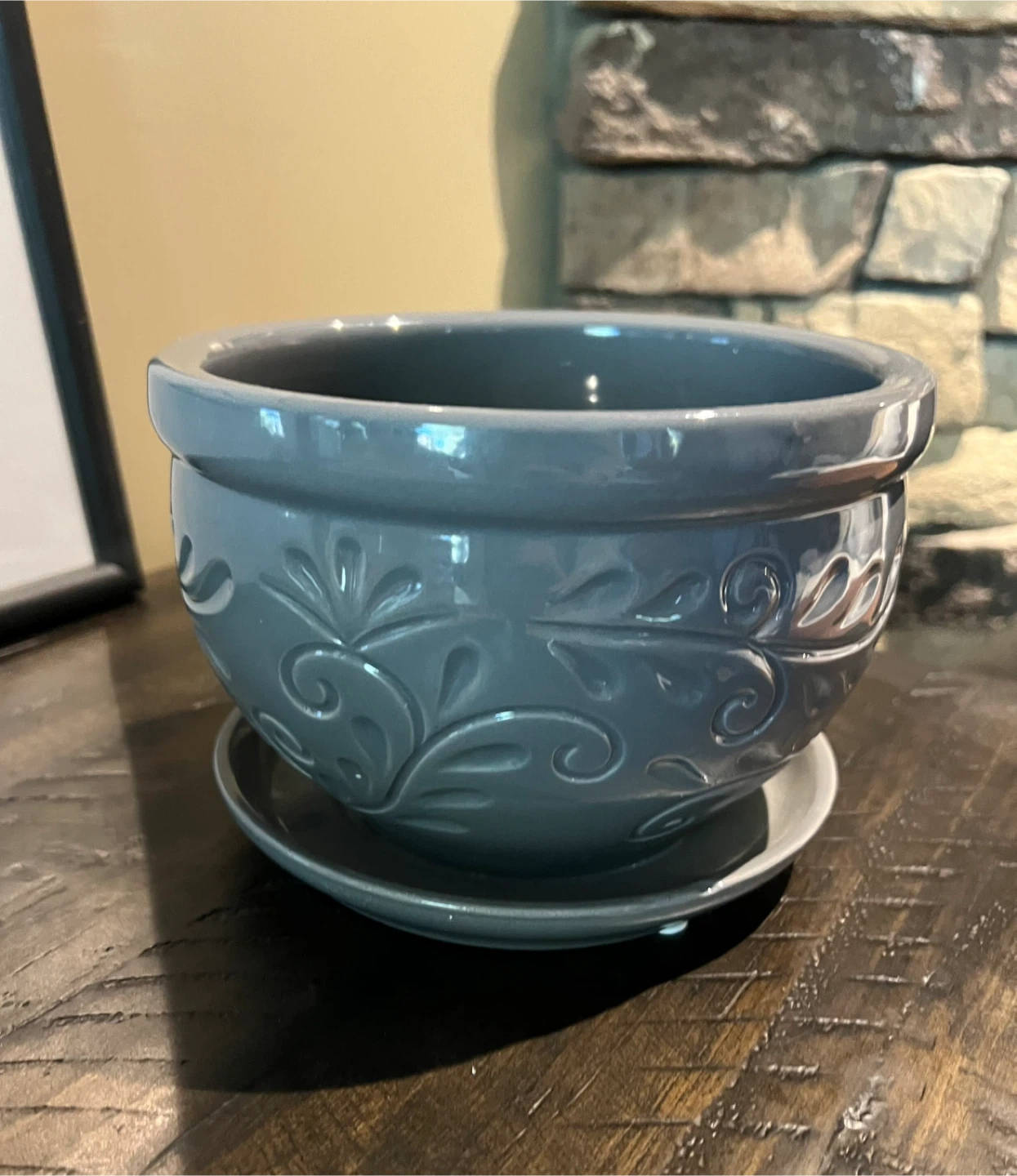 New ceramic planter/pot Attached matching saucer Drainage hole Dark grey colour with embossed leaf pattern Indoor/outdoor 7” diameter and 5” tall Waiting to be filled with your favourite blooms or greenery Asking $5 Interested? Message me and please check my other listings…