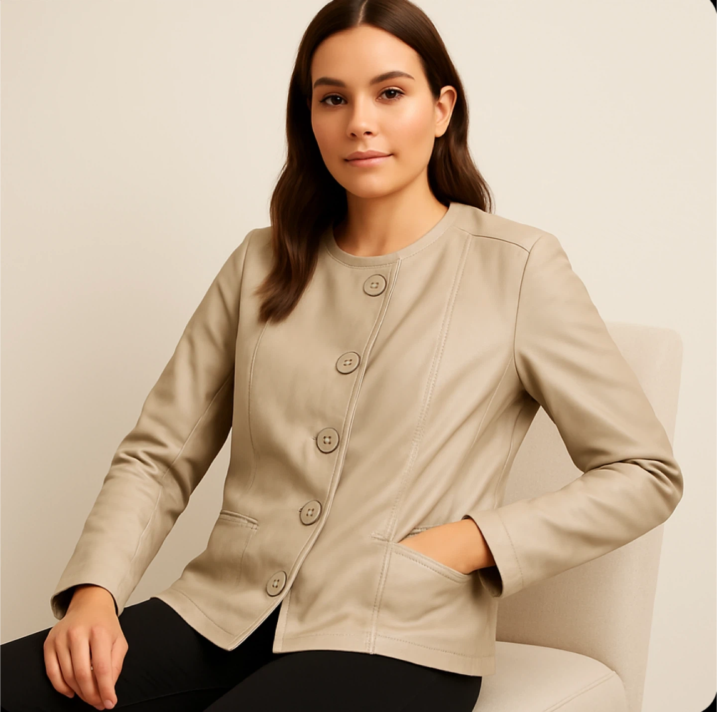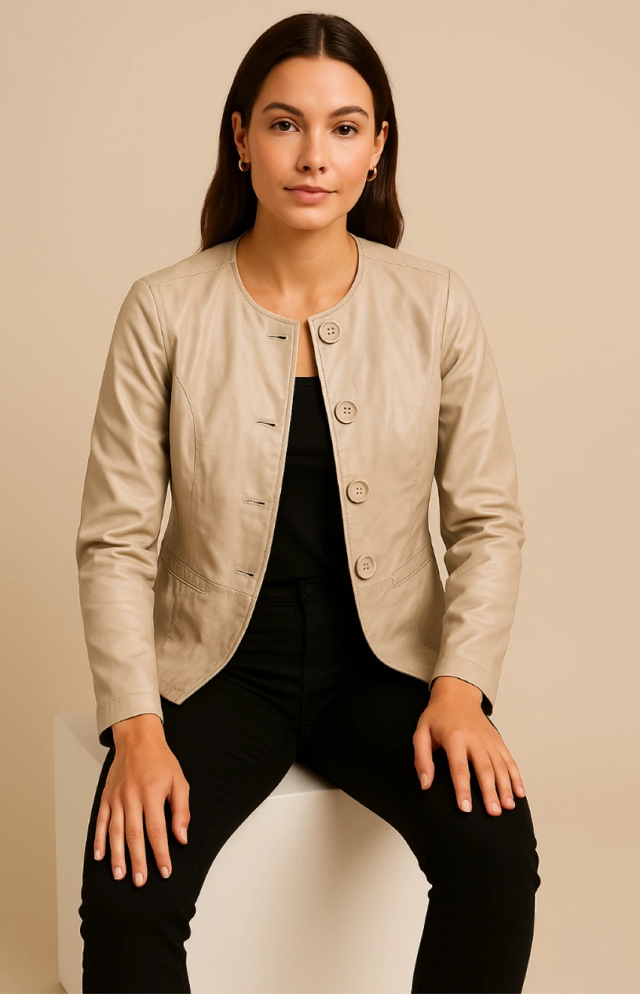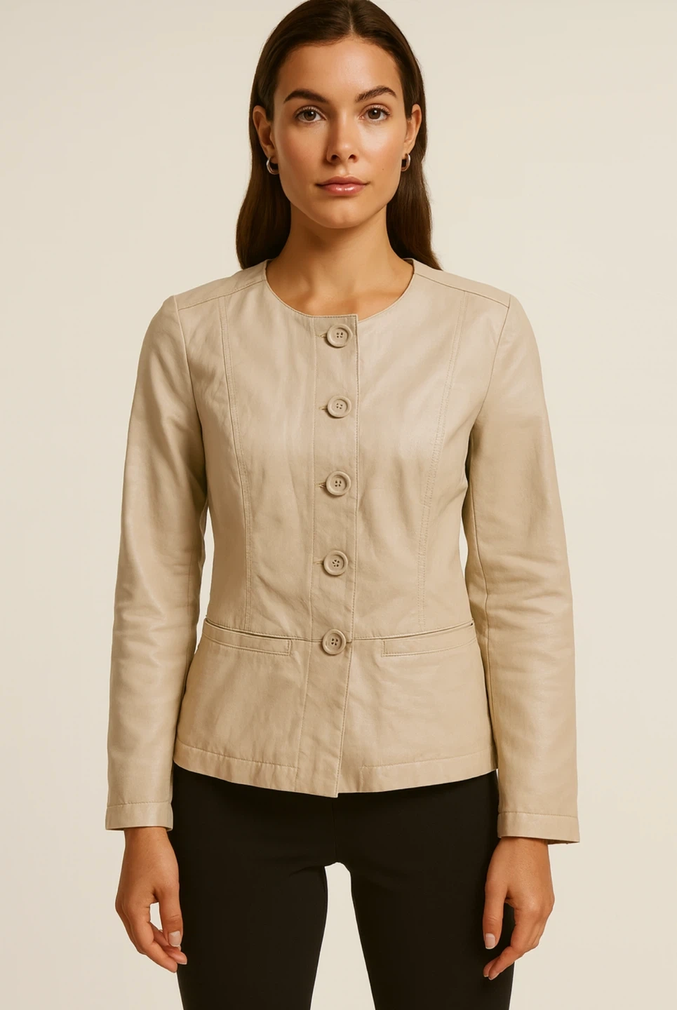 Veston élégant pour femme de la marque Cleo, couleur beige neutre, facile à assortir avec plusieurs styles. • Fermeture : boutons sur le devant • Poches latérales pratiques • Coupe : cintrée et féminine • Style : parfait pour bureau, sorties ou occasion chic • État : très bon, porté rarement