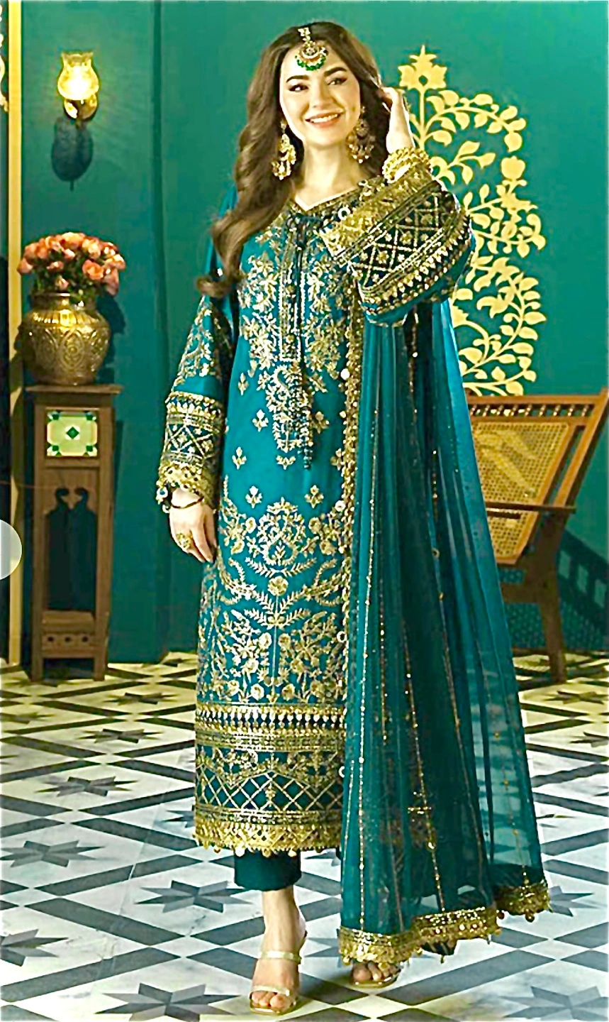 Beautiful teal salwar kameez with intricate gold embroidery. Perfect for a special occasion!