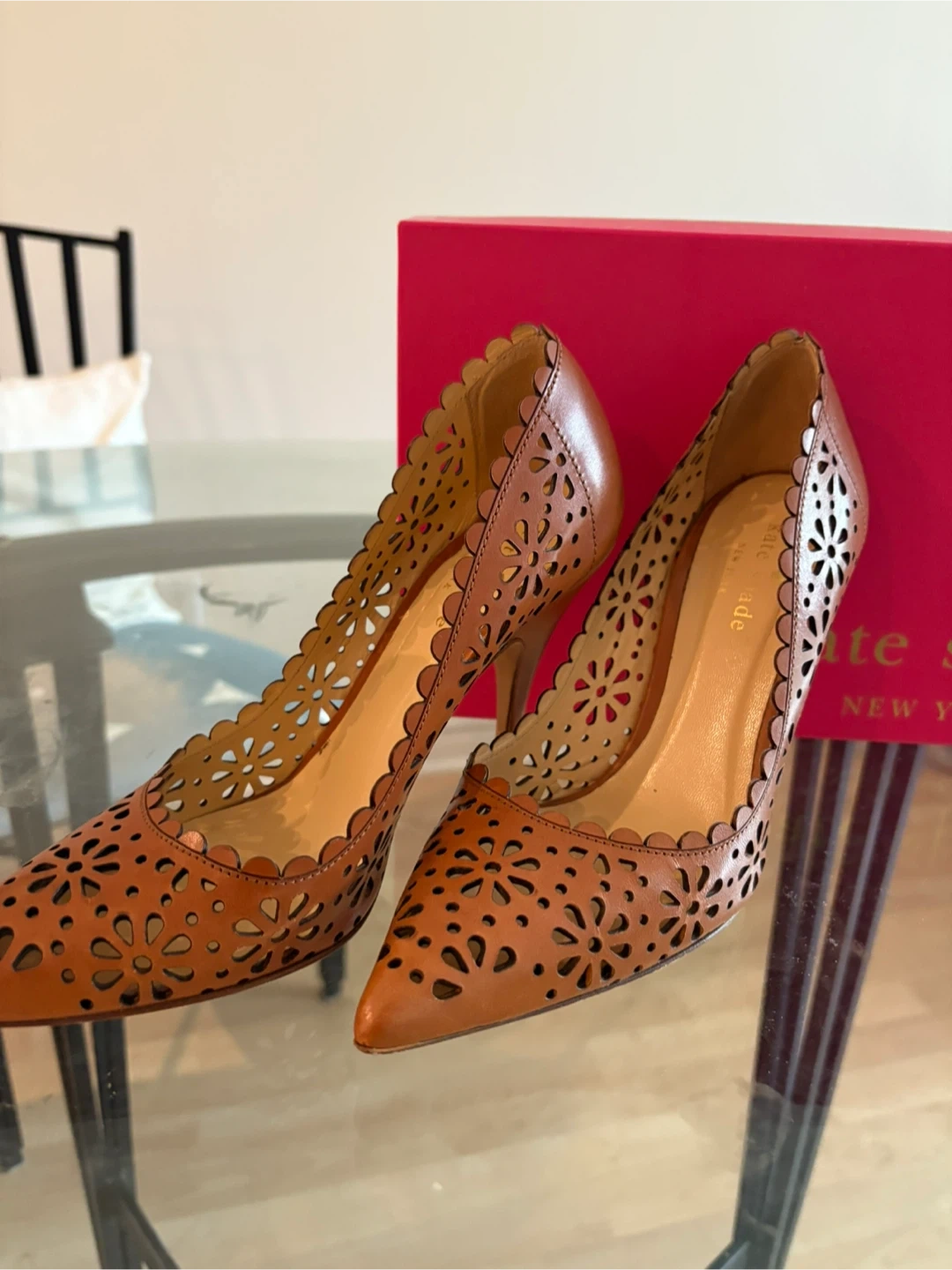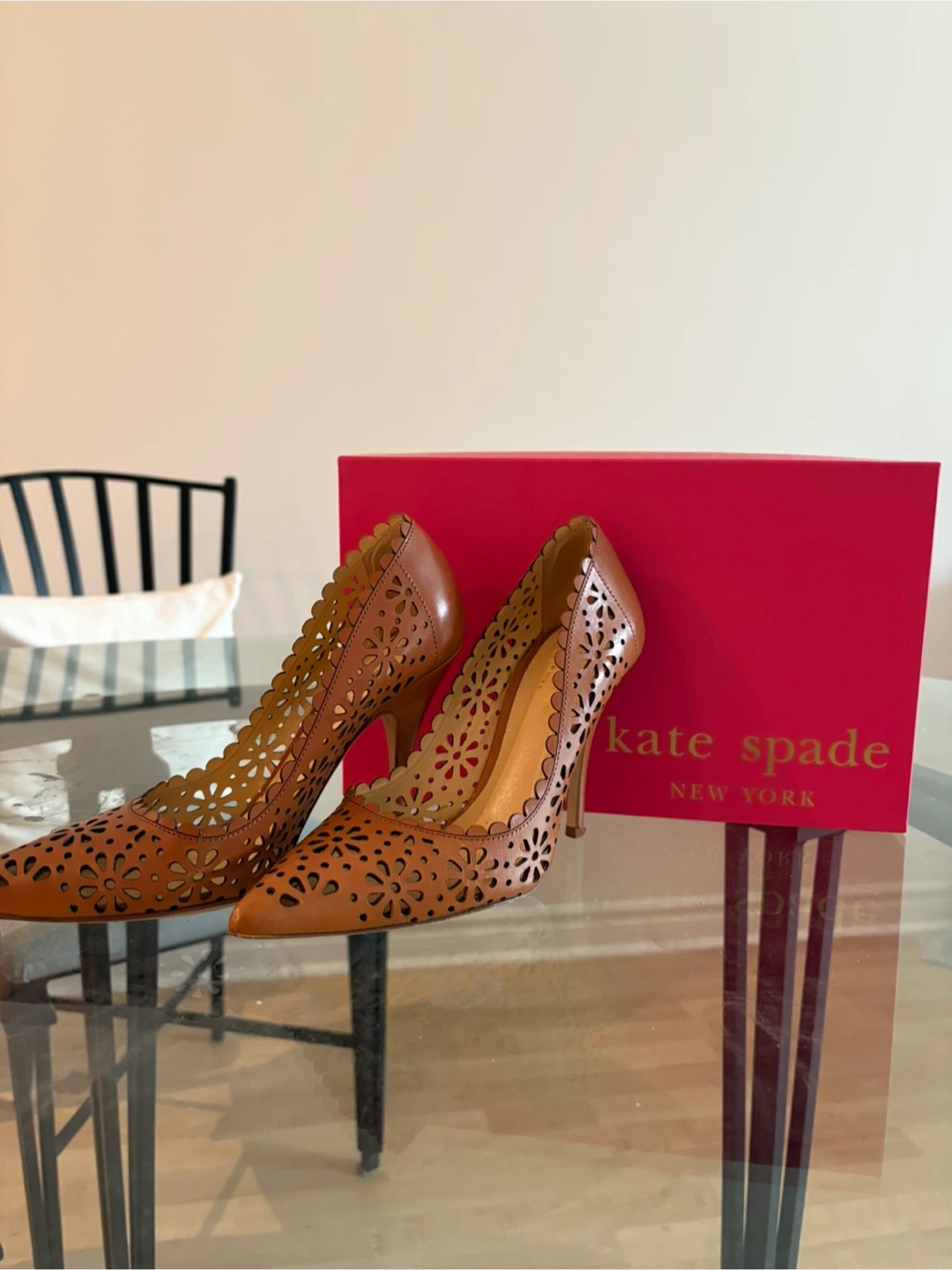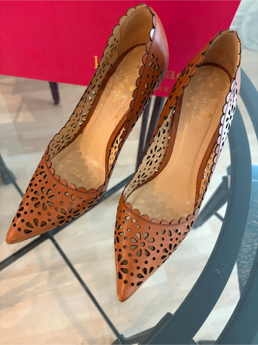 Beautiful Kate Spade Authentic heels. Light camel colour with a unique floral cutout design and a classic pointed toe. About 4” high. No platform. - Brand: Kate Spade - Size: 6.5 - Colour: light Camel - Material: Leather There’s sign of wear and tear on the heels (the little plastic caps) so I’d recommend getting the tips replaced if you want a brand new look. The left heel has a crescent shaped scuff - about 1cm. Not something you see when you wear it but visible if you’re inspecting the heel see the pics. Comes with the original box. Pick up near Yonge and York Mills.