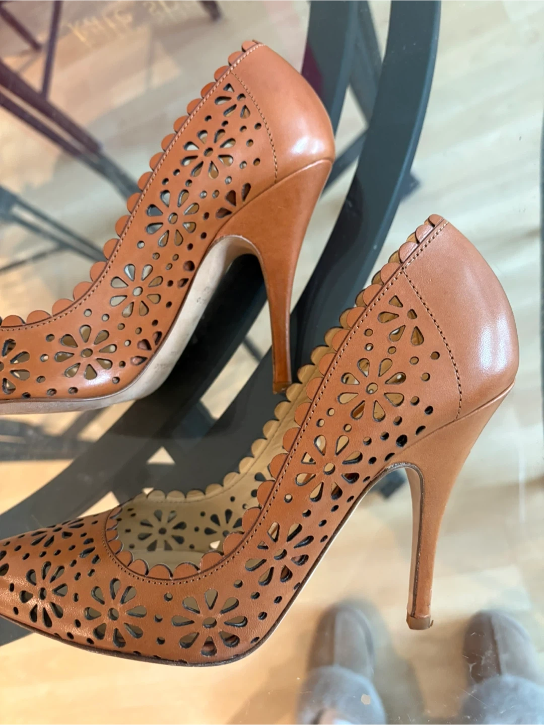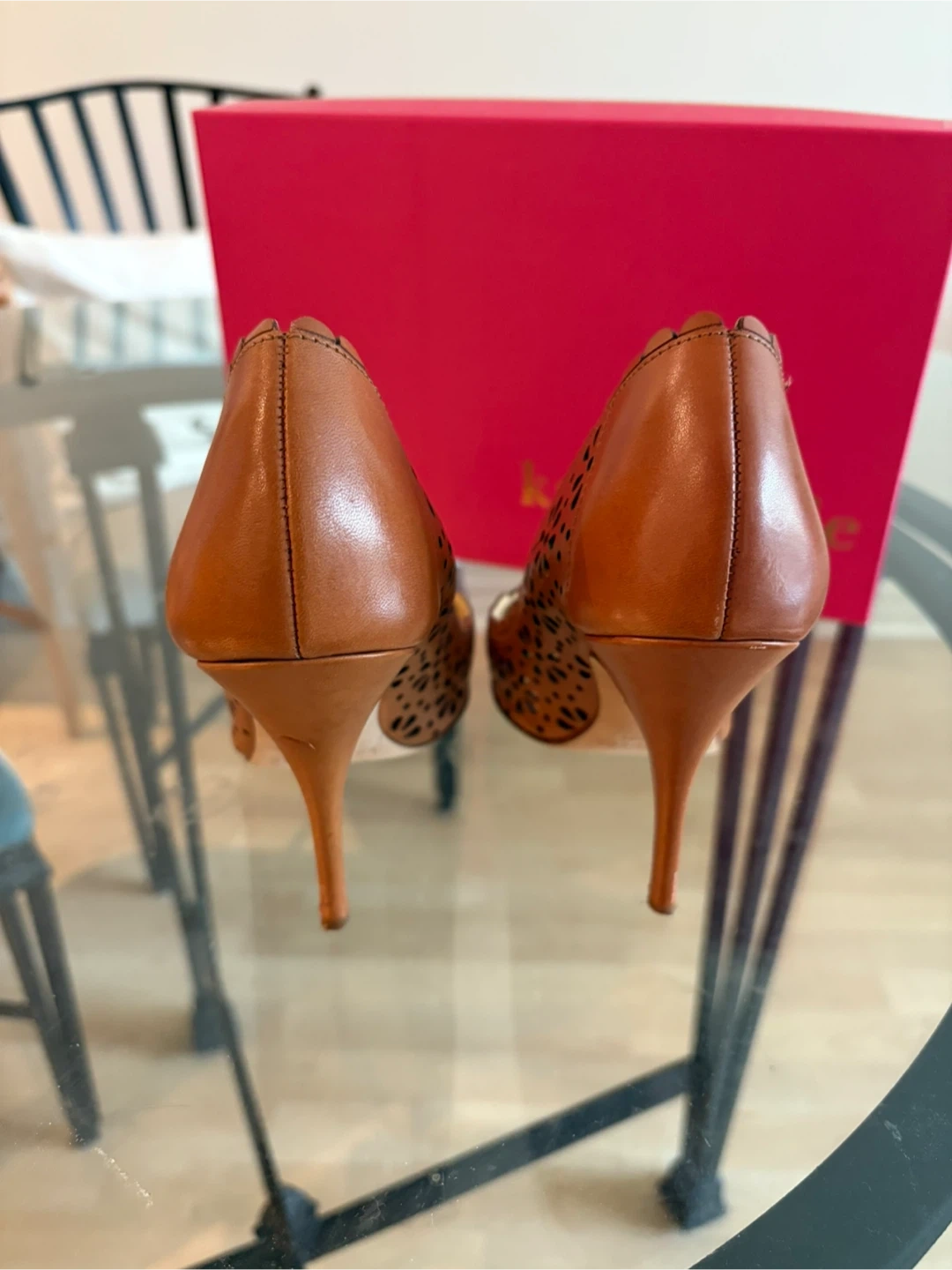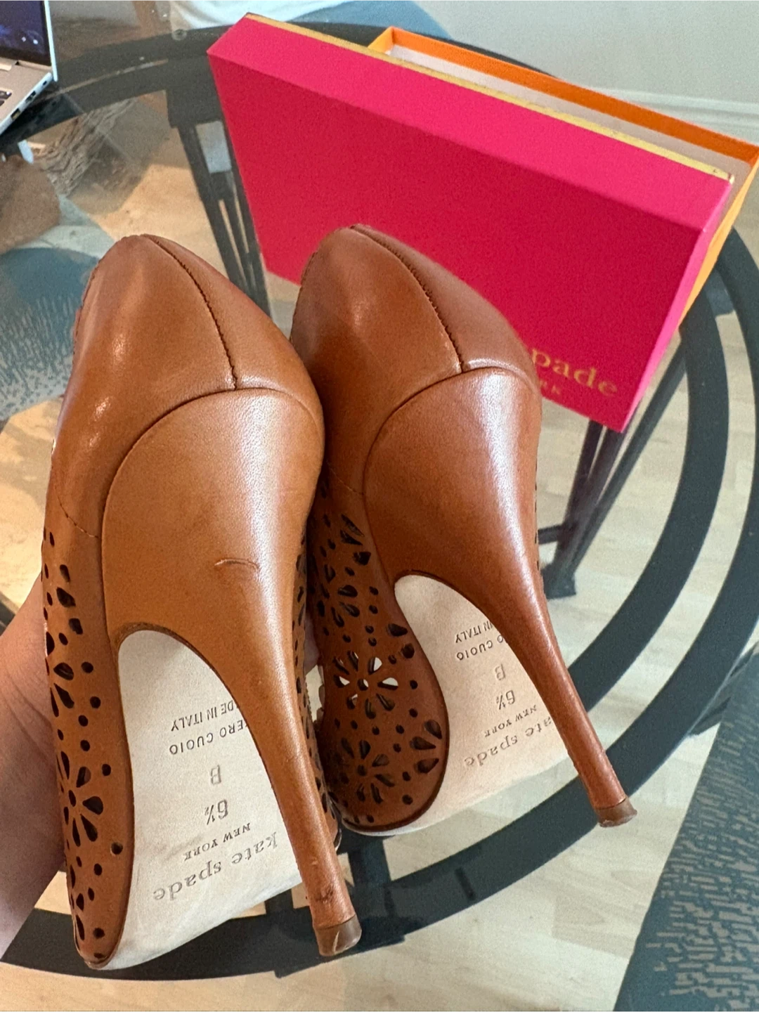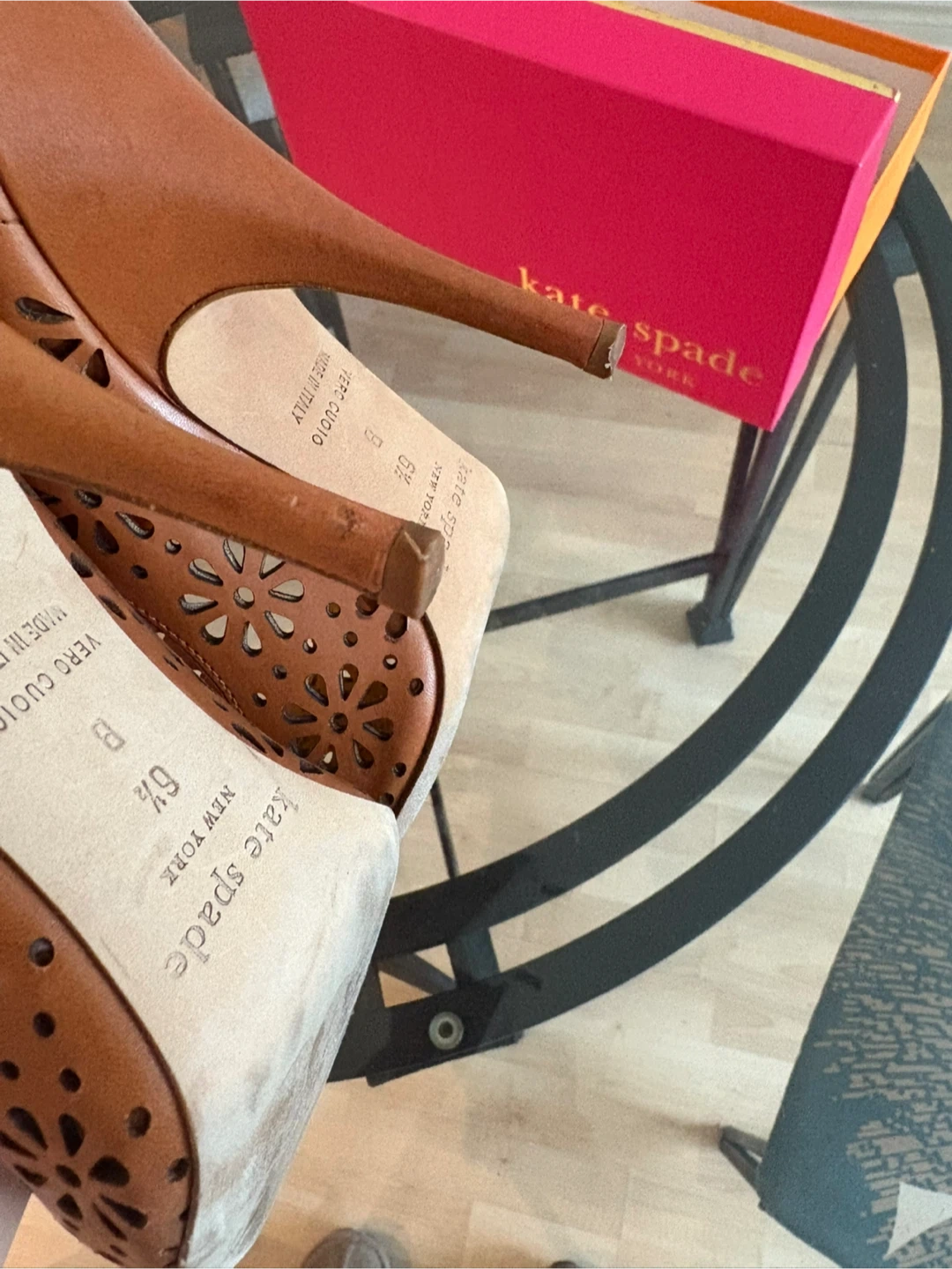 Beautiful Kate Spade Authentic heels. Light camel colour with a unique floral cutout design and a classic pointed toe. About 4” high. No platform. - Brand: Kate Spade - Size: 6.5 - Colour: light Camel - Material: Leather There’s sign of wear and tear on the heels (the little plastic caps) so I’d recommend getting the tips replaced if you want a brand new look. The left heel has a crescent shaped scuff - about 1cm. Not something you see when you wear it but visible if you’re inspecting the heel see the pics. Comes with the original box. Pick up near Yonge and York Mills.