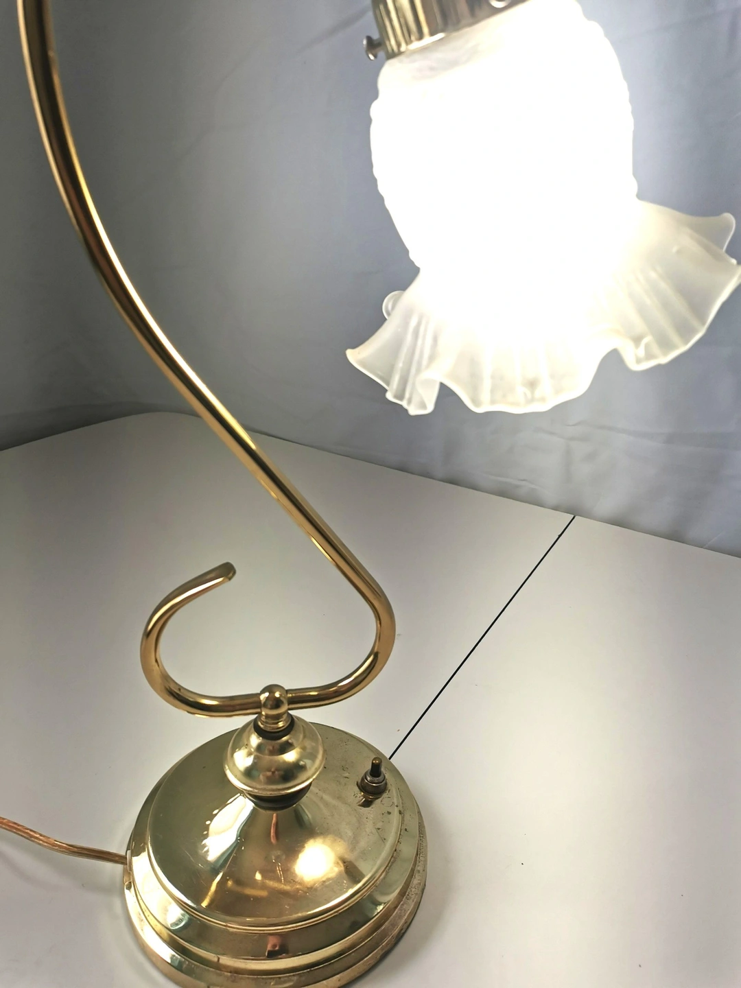 Beautiful vintage brass desk/table lamp in excellent condition. Elegant curved brass arm with ornate base Frosted glass shade with floral embossing and ruffled edge Inline switch and original cord in good working order Perfect for a study, reading nook, or as a statement décor piece This lamp combines functionality with timeless style and would make a lovely addition to any vintage-inspired home. Dimensions: approx. 18.5 " tall (with shade) , 10 inches wide